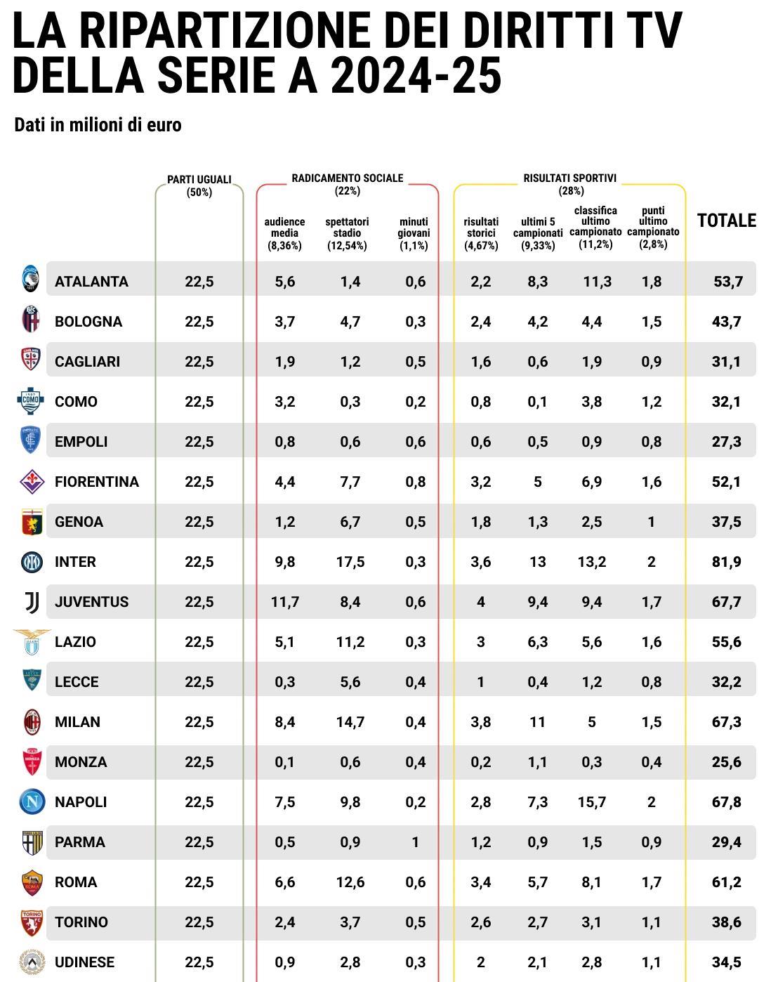 国米意甲电视转播收入技压群雄,依旧蝉联榜首,但比上赛季国米少收入两千多万欧元? 国际米兰上赛季虽然在意甲以一分之差获得亚军,但是电视转播费收入依旧是翘楚,拿波里排在第二。国米上赛季转播收入上亿,而这赛季少了两千多万欧元,最主要的原因就是海外版权每况愈下,意甲的没落跟呆梨足球联盟的不作为关联性太大具体排名如下: 1.国米 8190万欧元 2.拿波里 6780万欧元 3.尤文 6770万欧元 4.A米 6730万欧元 5.罗马 6120万欧元 6.拉齐奥 5560万欧元 7.亚特兰大 5370万欧元 呆梨足球正在温水煮青蛙,情况就是海外版权越卖越差。难道真的还让球迷在凌晨两点四十五分来煎熬吗?英超都可以把时间搞得亚洲地区晚上八九点,西甲也在逐步改善比赛时间,你呆梨足协依旧傲娇,依然视而不见亚洲球迷,那意甲俱乐部只会在电视转播费收入上越发糟糕!