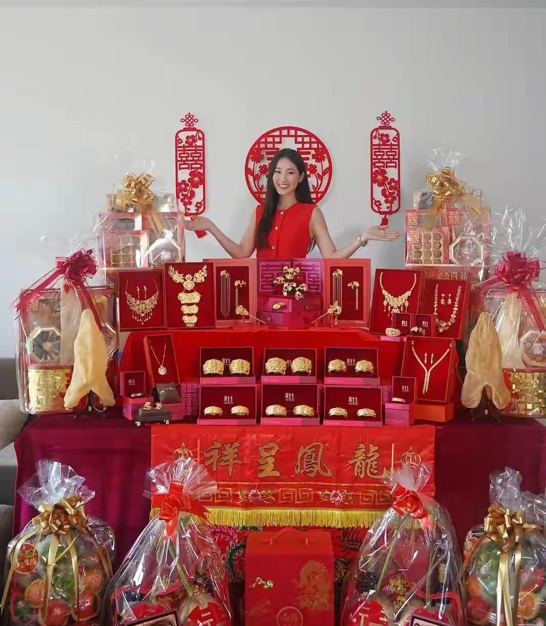【TVB前艺人黄碧莲完成传统过大礼,六对龙凤镯承载三代人祝福】[比心] 近日,刚于3月宣布离巢的TVB前艺人黄碧莲,在7月27日完成人生重要仪式——与圈外男友举行传统过大礼。这位在温哥华长大的"鬼妹仔",特意将客厅布置成喜庆的中式风格,鲍参翅肚等传统聘礼摆满长桌,最吸睛的是六对足金龙凤镯整齐排列,在灯光下泛着温润光泽。据了解,这些金饰由男方家族三代女性传承改良,镯身錾刻的并蒂莲图案暗藏手工匠人的巧思。黄碧莲在社交平台分享时透露,仪式当天收到近百位亲友的手写祝福卡,连TVB前同事都托人送来岭南特色礼饼。[比心] 谈及未来,黄碧莲表示婚礼将在海外私密举行,"场地只够摆三桌,但会把过大礼的金器全部带去,让长辈们见证这份心意"。[比心]