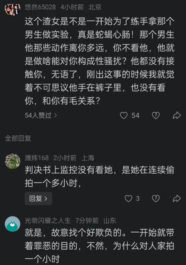 男生离她那么远,也几乎没看她。反倒是她拿着手机一直拍男生裤裆。真要说性骚扰,我觉得是杨景媛性骚扰男生!毕竟,哪有女生一直盯着男生裤裆看的!