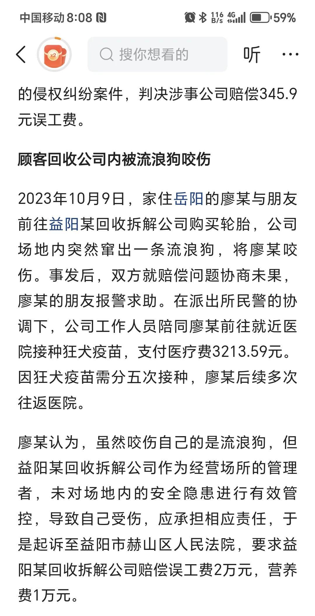 流浪狗咬伤顾客,涉事公司被判决赔偿误工费 消息来自三湘都市报。 各位老板,经理,校长,院长,领导们,在你们管理的区域内,流浪狗伤人了,是需要赔偿的。即使没有饲养,投喂流浪狗,也需要赔偿。所以必须及时处置。 虽然处置流浪狗会挨爱心人士的骂,但是真金白银的掏钱和挨两句骂,哪个更肉疼呢?
