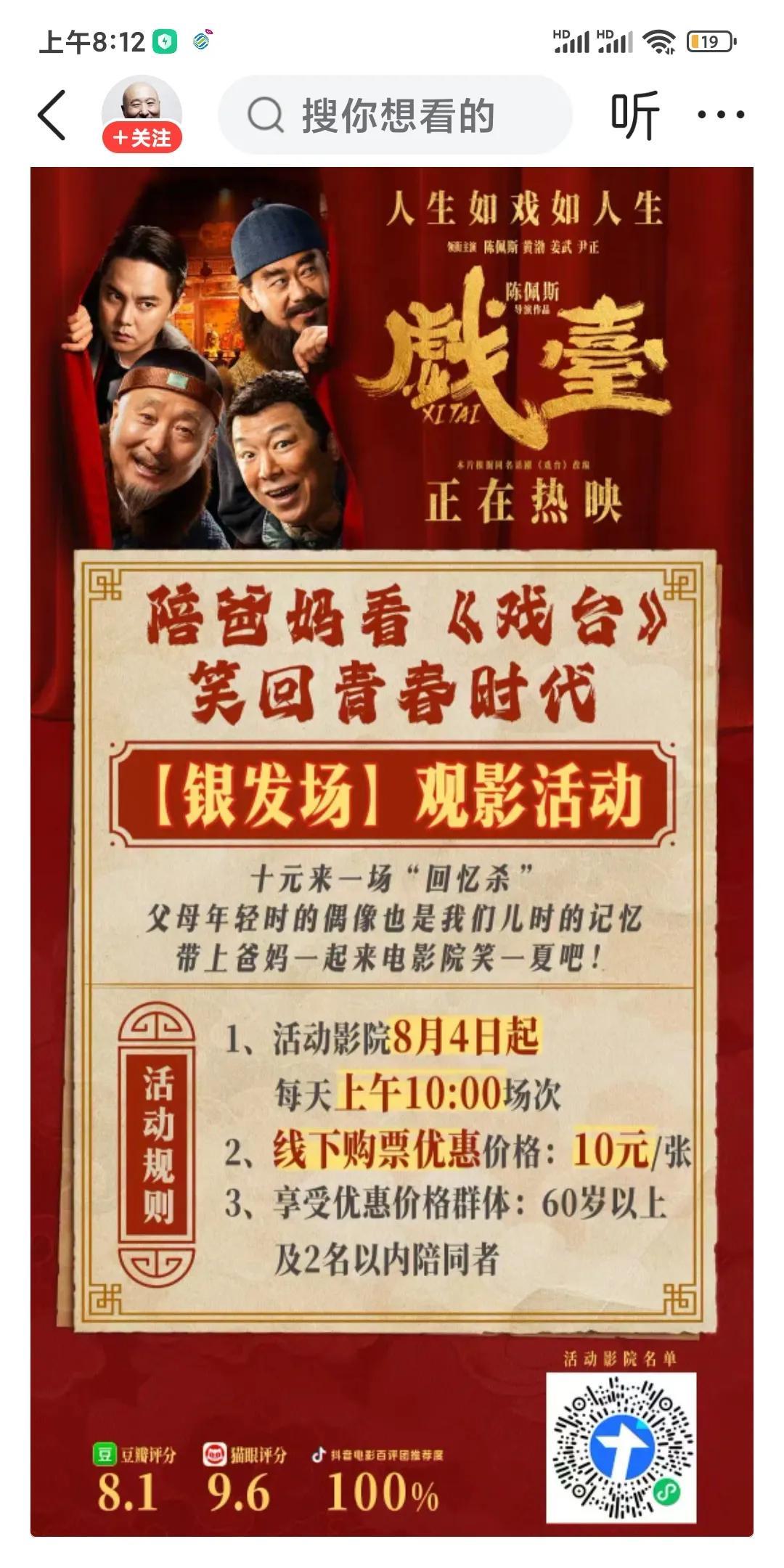 陈佩斯喊你10元看电影啦! 前几天老朋友聊天,我说看了电影,她脱口而出“戏台”,我说是,她说,哎,你看的时候咋不叫上我,我还寻思着去看看呢。 这朋友很喜欢看电影,以前我俩没少约着去看电影。