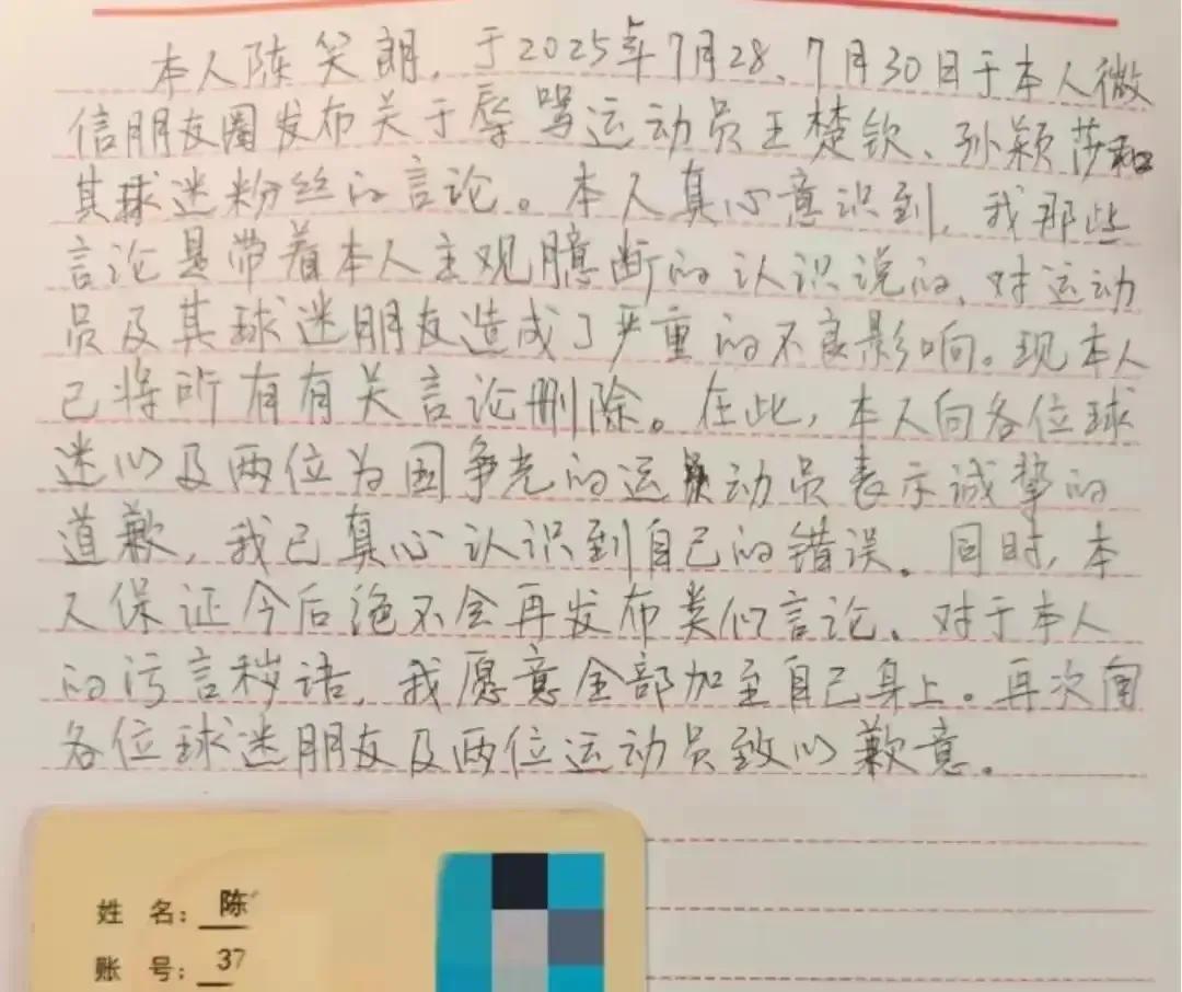 作为莎头的粉丝,我们只要求这三点: 1.学校开除陈笑朗。 2.王励勤表明态度。 3.法律制裁陈笑朗。 厦门大学,希望你们公平公正处理陈笑朗。 希望国乒保护好自己的队员,提起诉讼,这个陈笑朗达到侮辱罪的量刑标准了。 哪怕只坐一年牢,也是他为自己行为付出的代价。 作为粉丝,我们只要求三点: 1.学校开除陈笑朗。 2.法律制裁陈笑朗。 3.王励勤表明态度