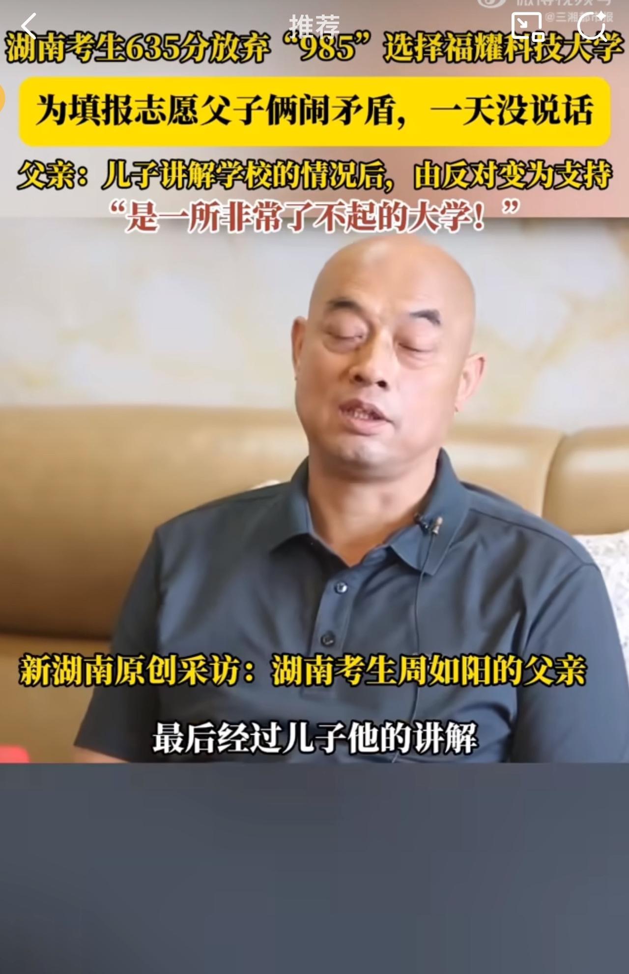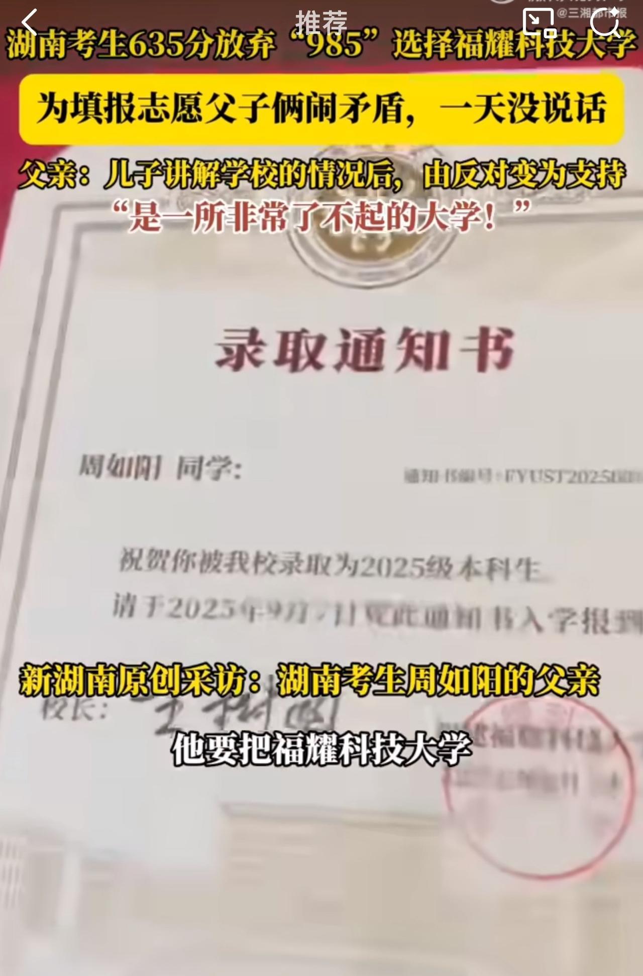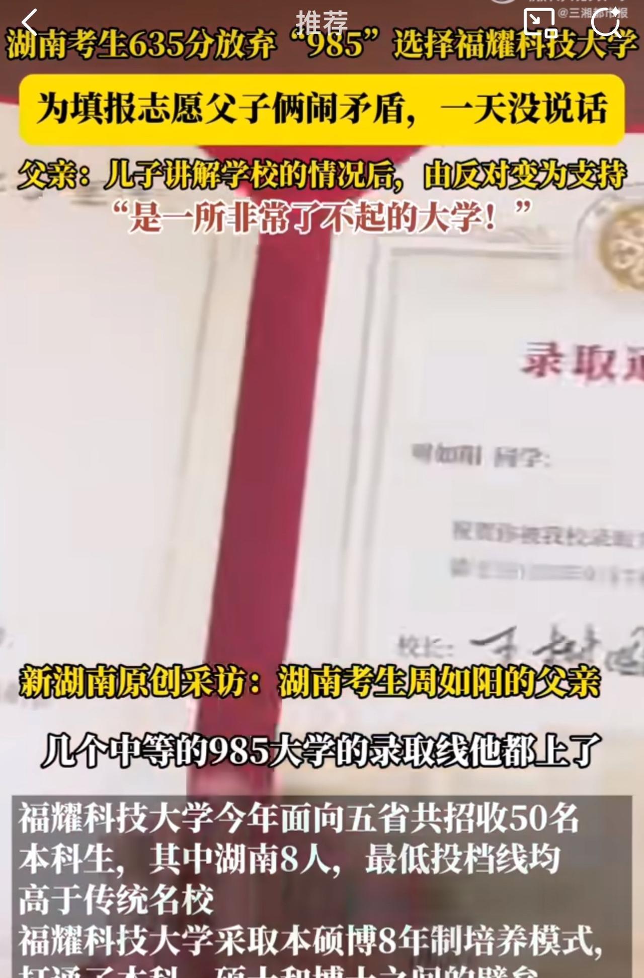 #MCN双量进阶计划#“这选择确实需要勇气!”近日,株洲攸县一中的周如阳考了635分,放弃985高校选择福耀科技大学,成为福耀科技大学在湖南录取的8名考生中的一员,为此两父子俩闹矛盾,引发全网热议。 针对此情况,该考生爸爸接受记者采访,这位爸爸说:“儿子周如阳今年高考635分,几个中等985大学的录取线都上了,然后他突然要填报福耀科技大学,为此自己就接受不了,发脾气一天没说话。最后,经过儿子的讲解,最终明白福耀科技大学是一所非常了不起的大学。所以,才从反对变为相信!” 对于网友们的质疑,这位考生周如阳说:“有人说我们是在当小白鼠,也有人说我们是在做正确的选择,不管怎样,我想好不好只有我自己进去、读完才能感知到。” 据悉,福耀科技大学今年首届招生仅50人,该校由企业家曹德旺捐资百亿创办、原西安交大校长王树国担任校长,主打“产学研融合”与“本硕博贯通培养”模式,学费按公办标准5460元一年收取。 对于这样的选择,周少想说周如阳这选择,换谁家长估计都得琢磨琢磨。高考635分能上985高校,却选了刚办的福耀科技大学,确实挺让人意外的。他爸一开始发脾气,其实也能理解,毕竟985的名头响,大家都熟悉,心里踏实。 不过,这所大学也不一般,曹德旺捐了一百亿,校长王树国还是以前西安交大的校长。而且,它主打的产学研结合、本硕博贯通,对想学技术的学生来说,说不定是个好机会。学费跟公办大学一样,经济上也没额外负担。 周如阳说“好不好自己读了才知道”,这话挺实在。有时候选大学,不光看名气,还得看适不适合自己。有人觉得是当“小白鼠”,也有人觉得是抓机会,其实都有道理。毕竟每个人想要的不一样,有人图稳定,有人想闯闯。 对于这位湖南考生高考636分放弃985高校,选择福耀科技大学,大家怎么看呢?#寻美三湘# #长沙新朋友#