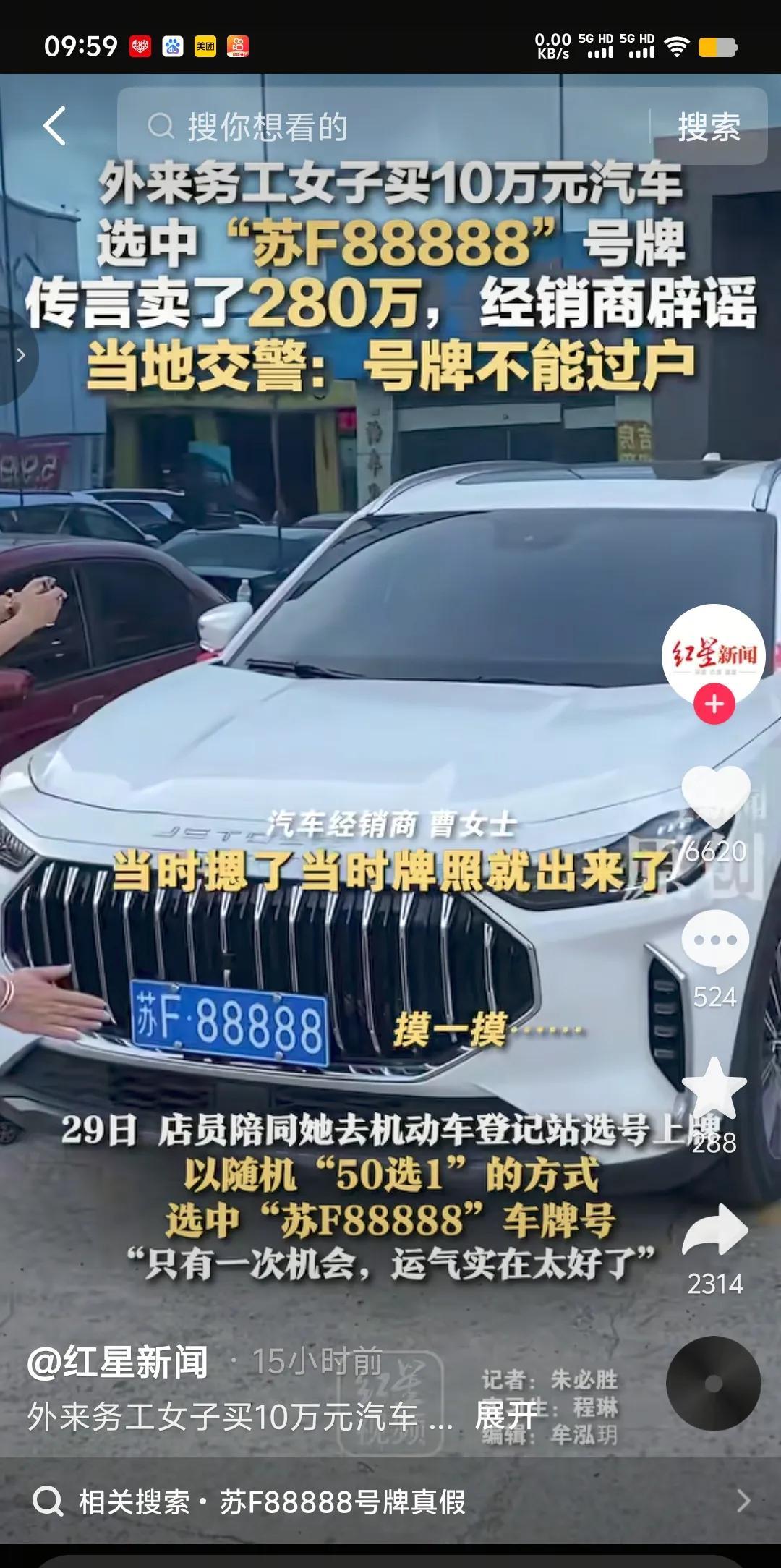 听说过摇彩票中奖的,但很少听说过摇车牌中奖的,外地打工的杨女士在江苏南通买了一台10万左右的奇瑞捷途越野车,在随机“50选一”选号牌时,幸运的选中了苏F88888,可以说是比买彩票中大奖都难。豹子号五个8,不带任何字母。当下二手车贩子出价110万想买,还有人出价200万,据说当天下午有人出价280万,挂在一辆兰博基尼车上了。 在车管所能摇到5个8纯数字豹子号,不得不说这已经不是运气的问题,就怕你运气好也摇不上。不过当地交警说“机动车可以过户,但号牌不能过户”,如果真像交警所说,那么这位幸运的杨女士想变现看来也不太可能。