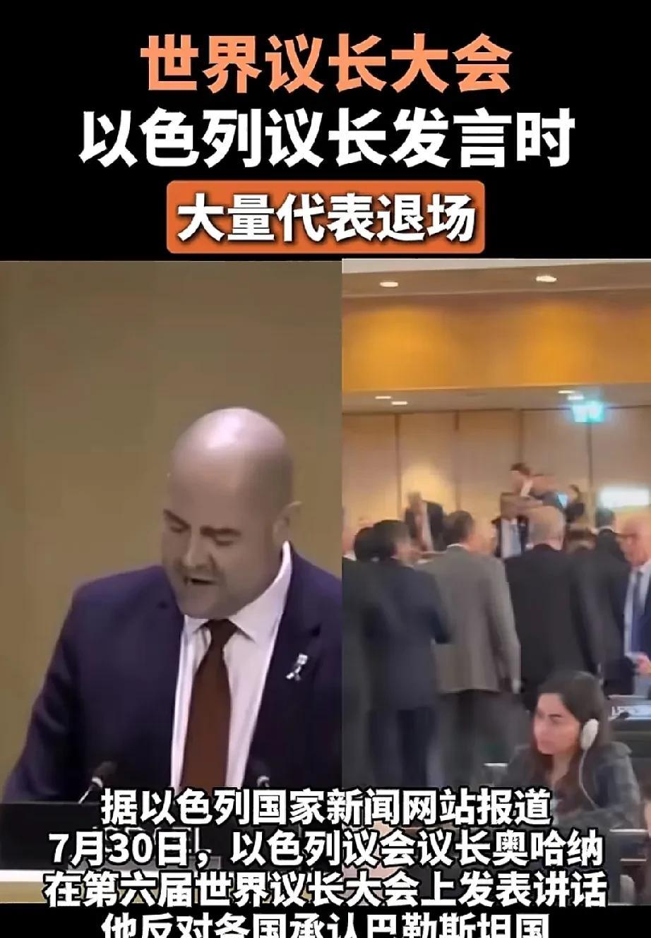 世界联合议长联盟:抵制以色列,支持巴勒斯坦建国。 7月30日日内瓦世界联合议长联盟会议以色列议长讲话,多国代表退场,表达对以色列加沙实施“种族灭绝”表示不满。 早一天以色列内阁多个部长表示加沙是以色列的心脏地带,驱逐巴勒斯坦人建立犹太人社区,直接不装了,赤裸裸的占领。 英法两国宣布承认巴勒斯坦建国,随后加拿大也宣布承认巴勒斯坦建国,欧洲已经有十几个国家承认或者正在承认巴勒斯坦。西方除了美国外,正在孤立以色列。 以色列外长在议长联合会上批评英法两国承认巴勒斯坦建国起了一个坏的开始,表示英法两国可以让巴勒斯坦人在英法两国建国,那样他们就能享受以色列的“苦难”。 以色列对加沙行为已经不被世界认可,越来越多的国家已经认识到被以色列骗了。以色列一直打着种族受害者的身份对加沙实施种族灭绝。