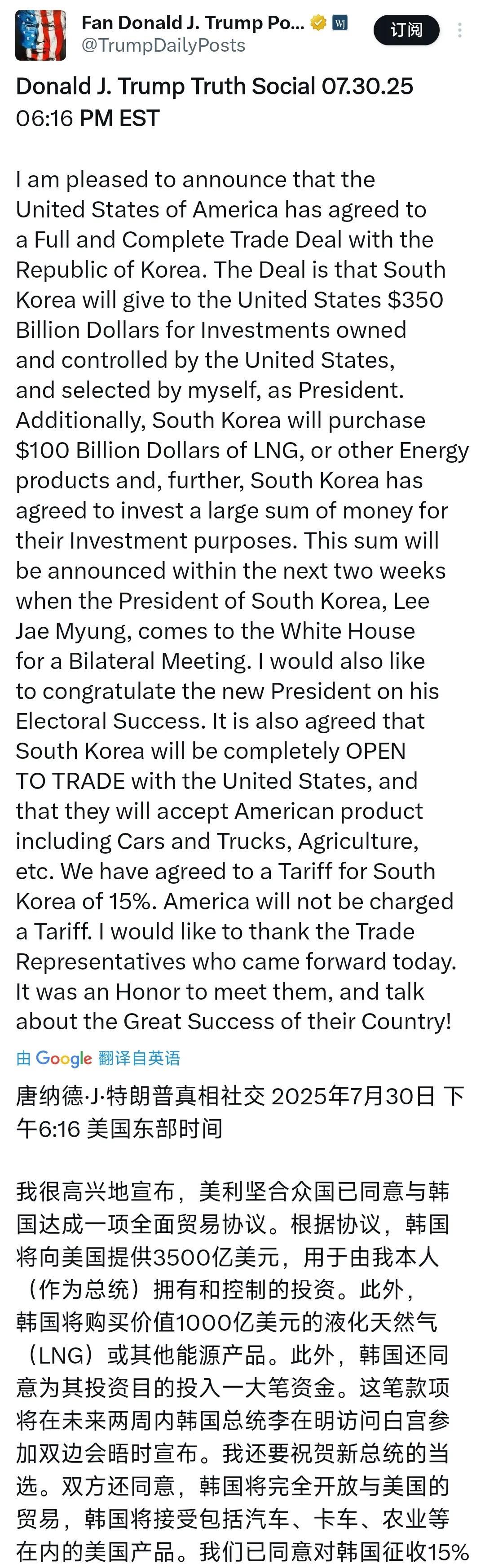 特朗普今天(北京时间7月31日)宣布与韩国达成了贸易协议。特朗普写道:“我高兴地宣布,美利坚合众国已同意与大韩民国达成一项全面和全面的贸易协议。协议是,韩国将向美国提供3500亿美元,用于美国拥有和控制的投资,并由我作为总统挑选。此外,韩国将购买1000亿美元的液化天然气或其他能源产品,此外,韩国已同意为其投资目的投资一大笔钱。这笔款项将在未来两周内宣布,届时韩国总统李在明将到白宫举行双边会谈。我还要祝贺新总统在选举中取得成功。双方还商定,韩国将对与美国的贸易完全开放,他们将接受美国产品,包括轿车和卡车、农业等。美国不会被征收关税。我要感谢今天到场的贸易代表们。我很荣幸能见到他们并谈论他们国家的巨大成功!”