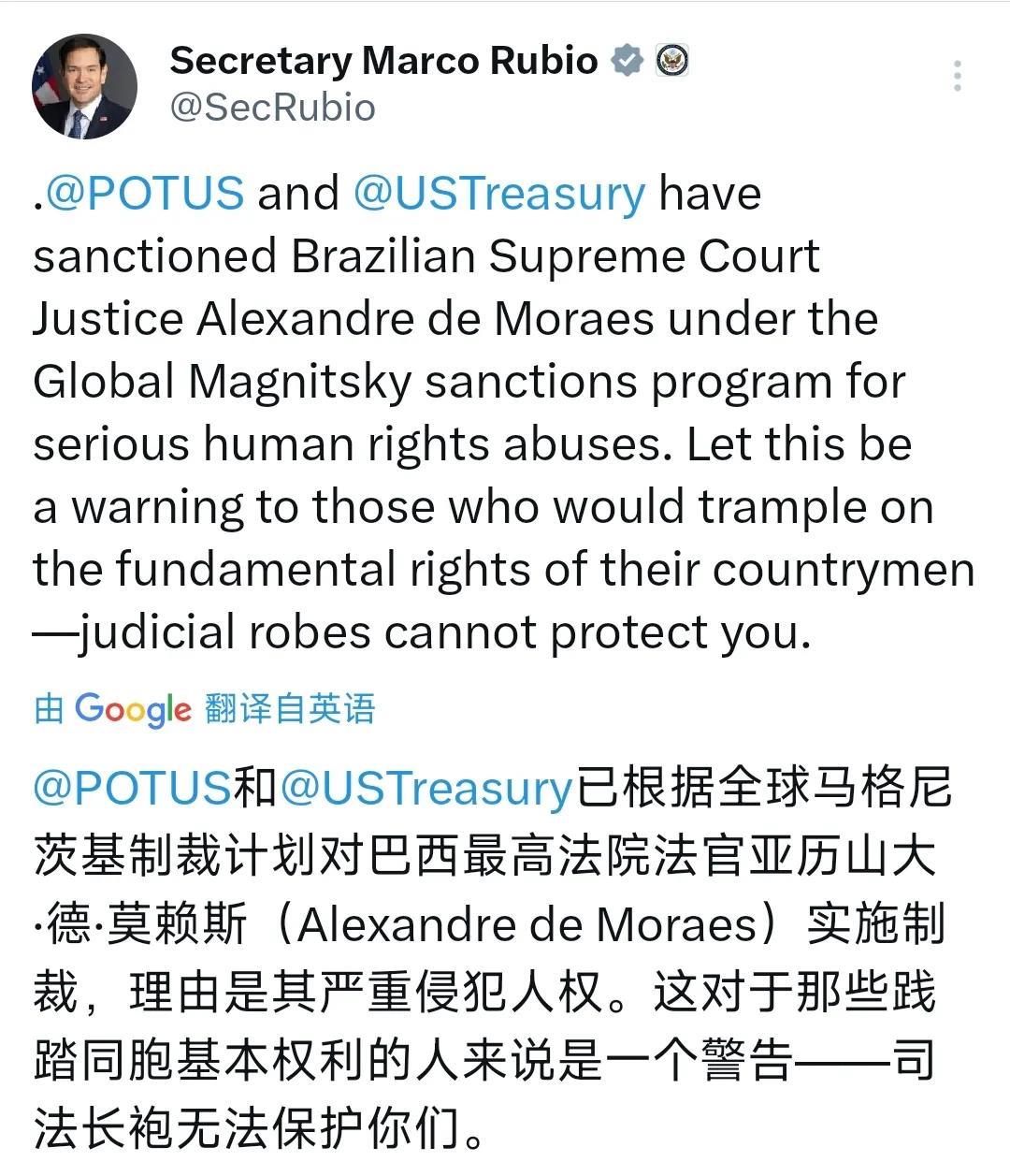 美国国务卿鲁比奥今天(北京时间7月31日)写道:“特朗普总统和美国财政部已根据全球马格尼茨基制裁计划对巴西最高法院法官亚历山大·德·莫赖斯实施制裁,理由是其严重侵犯人权。这对于那些践踏同胞基本权利的人来说是一个警告——司法长袍无法保护你们。”