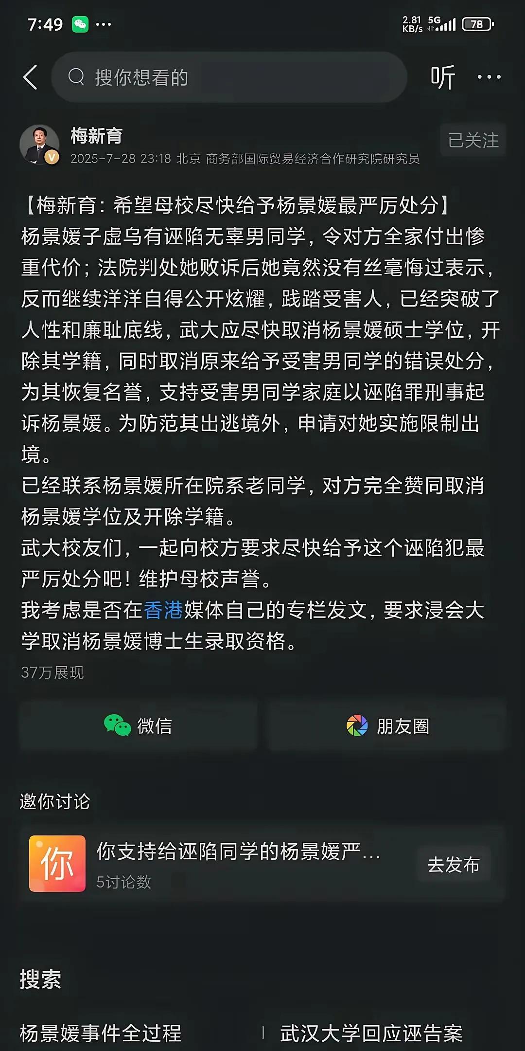 污蔑同学,还要出来嘚瑟一番,这人真是够丑陋的! 最近武汉大学这名杨景媛同学,样子