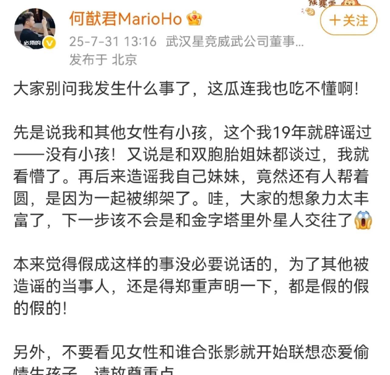 何猷君发帖回应传闻,称都是子虚乌有!帖子的最后一句还从女性角度出发,尽显高情商!
