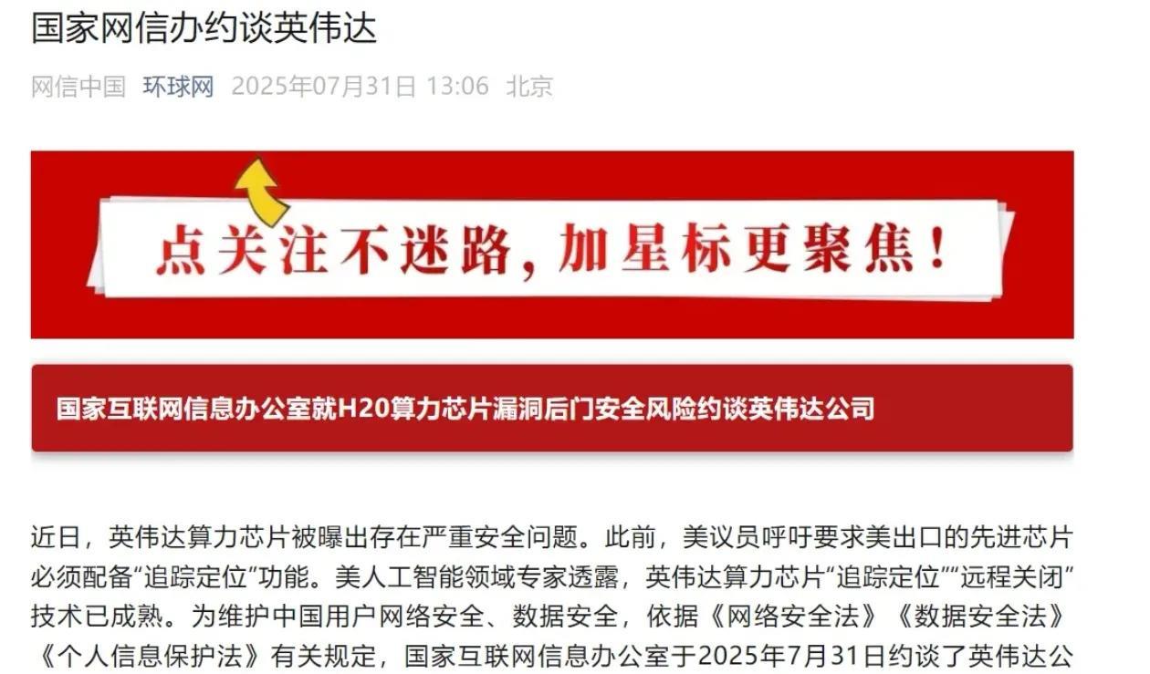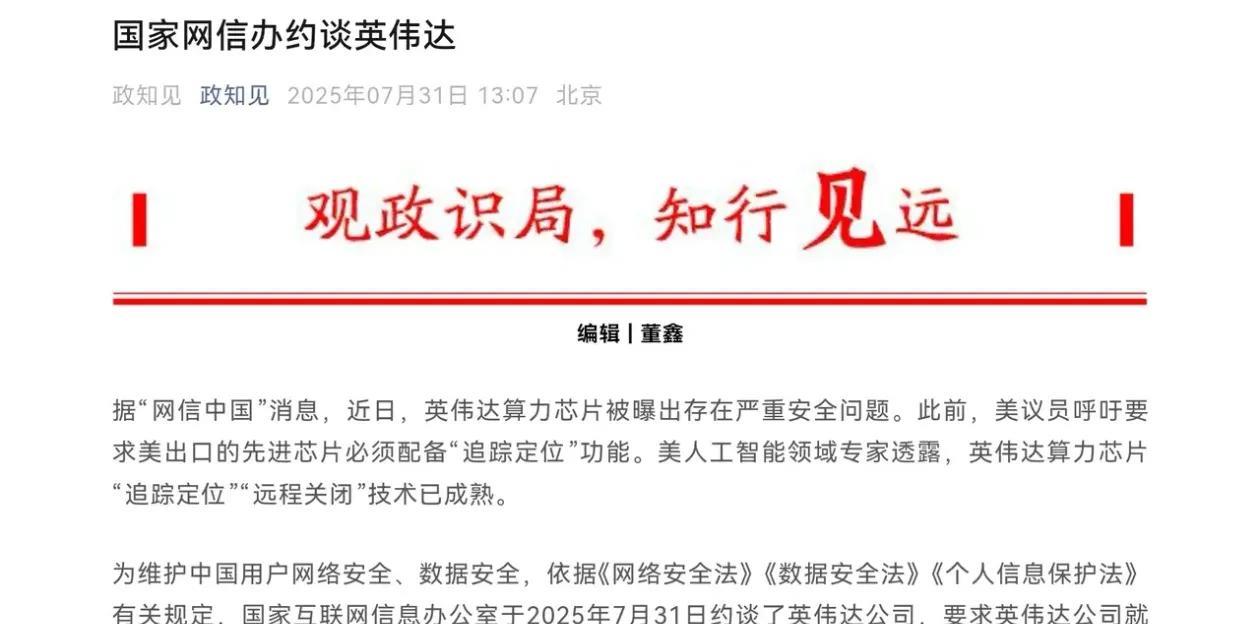 果然有鬼!央视曝光:英伟达芯片有安全后门 我早就说英伟达突然对华特供芯片,是芯片领域的“特洛伊木马”,现在看,印证了吧? 随着央视曝光,英伟达因H-20芯片被约谈,这一切都浮上了水面…… 那些为黄仁勋喝彩,吹捧的人,出来聊聊? 这是黄仁勋干的还是美国特工架空他干的? 值得注意的是,中美瑞典谈判刚结束,这个被视为美国对华芯片封堵出现松动的信号,就被按在地上摩擦了…… 说明什么呢? 我粗浅的看法是,首先是美方的诚意不够,他们不单用阉割的芯片糊弄我们,还干了很脏的事…… 其次,这也是好消息。 英伟达算力芯片有一个“追踪定位”技术,据华尔街消息显示,他的“远程控制”能力已经成熟。 现在被我们发现了,说明了什么呢? 说明英伟达自以为是的技术优势,在我们面前折戟了…… 想瞒天过海,现在要求其提供安全漏洞证明材料,以印证安全风险,黄仁勋或许早有准备,但,他一定不会想到来的如此之快。 至于公家的事,央视曝光,就自然有人管,而我们普通人还是要选华为这样的国产品牌,事关信息安全,这是切身利益。 您说对吧? #头号创作者激励计划# #新闻#