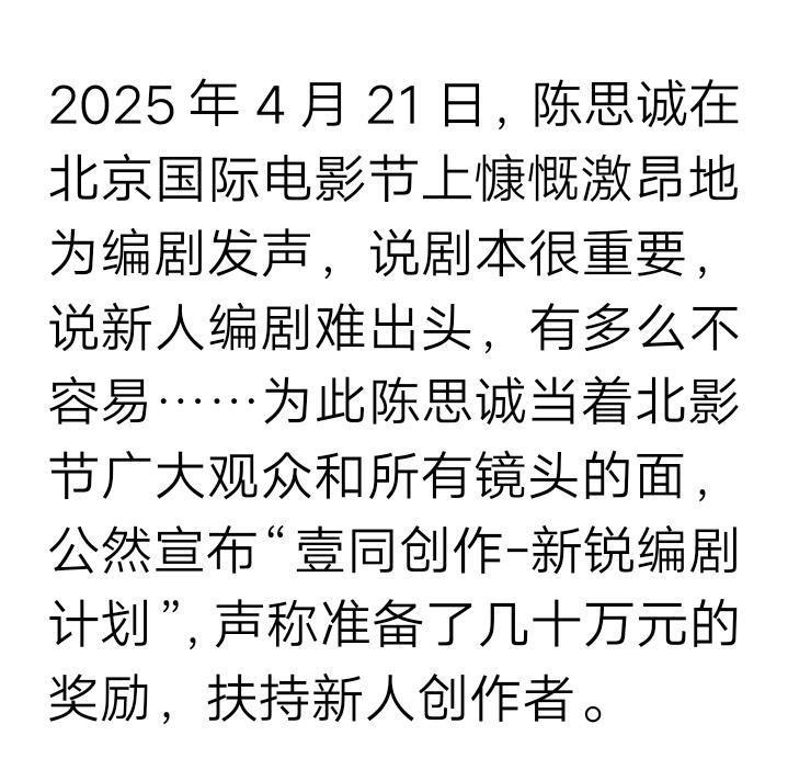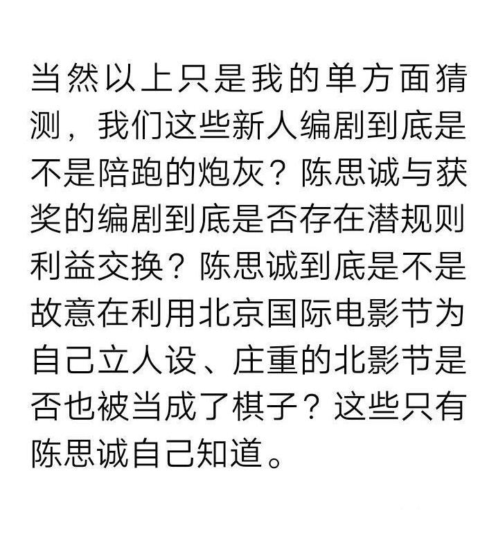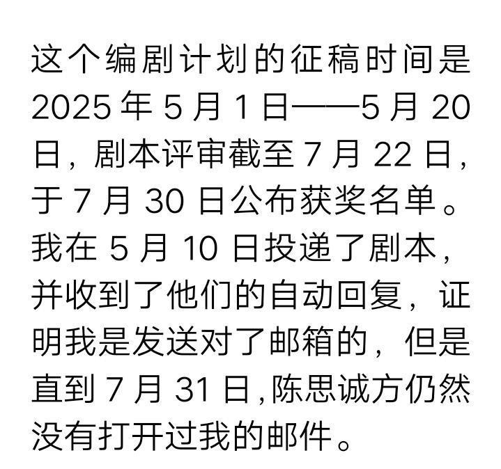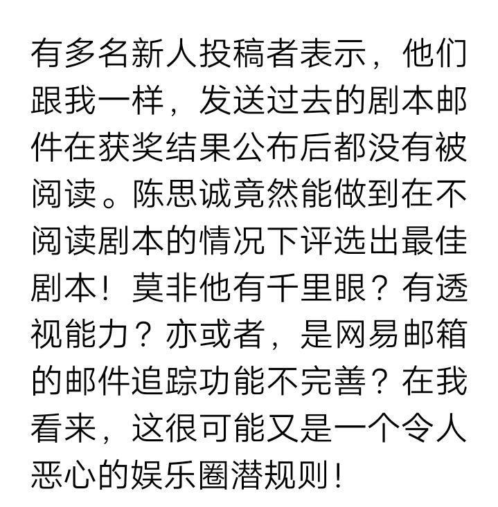陈思诚,这是怎么了? 好心办坏事,还是真的被戳穿了啊? 事情不复杂。 早上刷到一名网友对陈思诚不满的帖子。事情是这样的。 陈思诚4月份在北京国际电影节上,又为编剧说话,说新人编剧不容易等等,又立刻宣布开启一个“壹同创作-新锐编剧计划”,说要拿出几十万奖励,扶持新人编剧。给自己拉了不少好感。 然后,这名网友就真的参加了这个比赛,并且,把自己的作品投稿了。 可是,直到7月30日,比赛结果都公布了。这名网友发现自己的邮件都没有被打开过,显示未读。 因此,网友质疑陈思诚比赛是假,有内定嫌疑。给出的理由是获奖的人,大多都是老面孔,有过作品。而跟他一样的新人编剧们,不少都遇到跟他一样的情况:连作品都未被查看。 大家怎么看?