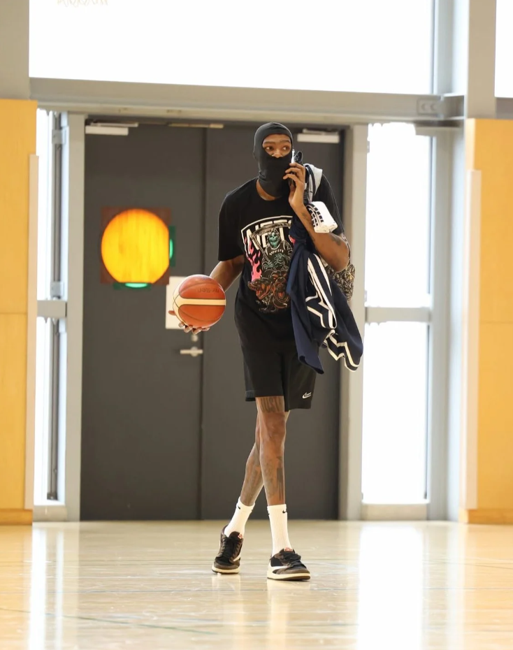 火箭自媒体COACH晒:火箭新援凯文-杜兰特休赛期蒙面训练照片。 杜兰特身着ni