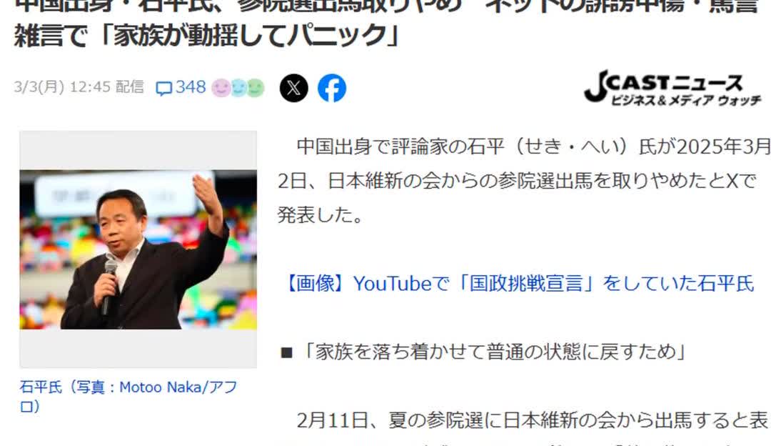 这个人是21世纪最坚定的汉奸,不仅换了国籍名字,还去日本参加大选 他的名字叫石平太郎,以前叫石平。 石平1962年出生于成都,2002年的时候凭着一本名为《中国人为什么要憎恨日本人》的书出道成了日本家喻户晓的专家。 这本书的大致内容有三个: “日本的战争罪行都是中国政府造谣的” “中国政府搞反日教育让中国人仇恨日本人” “中国的最终目的是要通过侵略日本,实现征服世界” 也因为这本书,他被日本右翼看作是“弃暗投明”的典型。2007年石平更是直接加入日本国籍,改名为石平太郎。 今年石平太郎作为一位坚定的反华分子,一个深爱日本的汉奸,正式参加日本大选,想要竞选参议员,但是日本网络上全都是反对的声音,平时支持他的日本右翼群体对他破口大骂。甚至还进行人身迫害。 最后石平太郎宣布:“因为自己和家人遭受了严重的造谣和网暴,为了保护家人不受到伤害,自己决定退出选举。” 这就是当汉奸的下场:最后里外不是人。