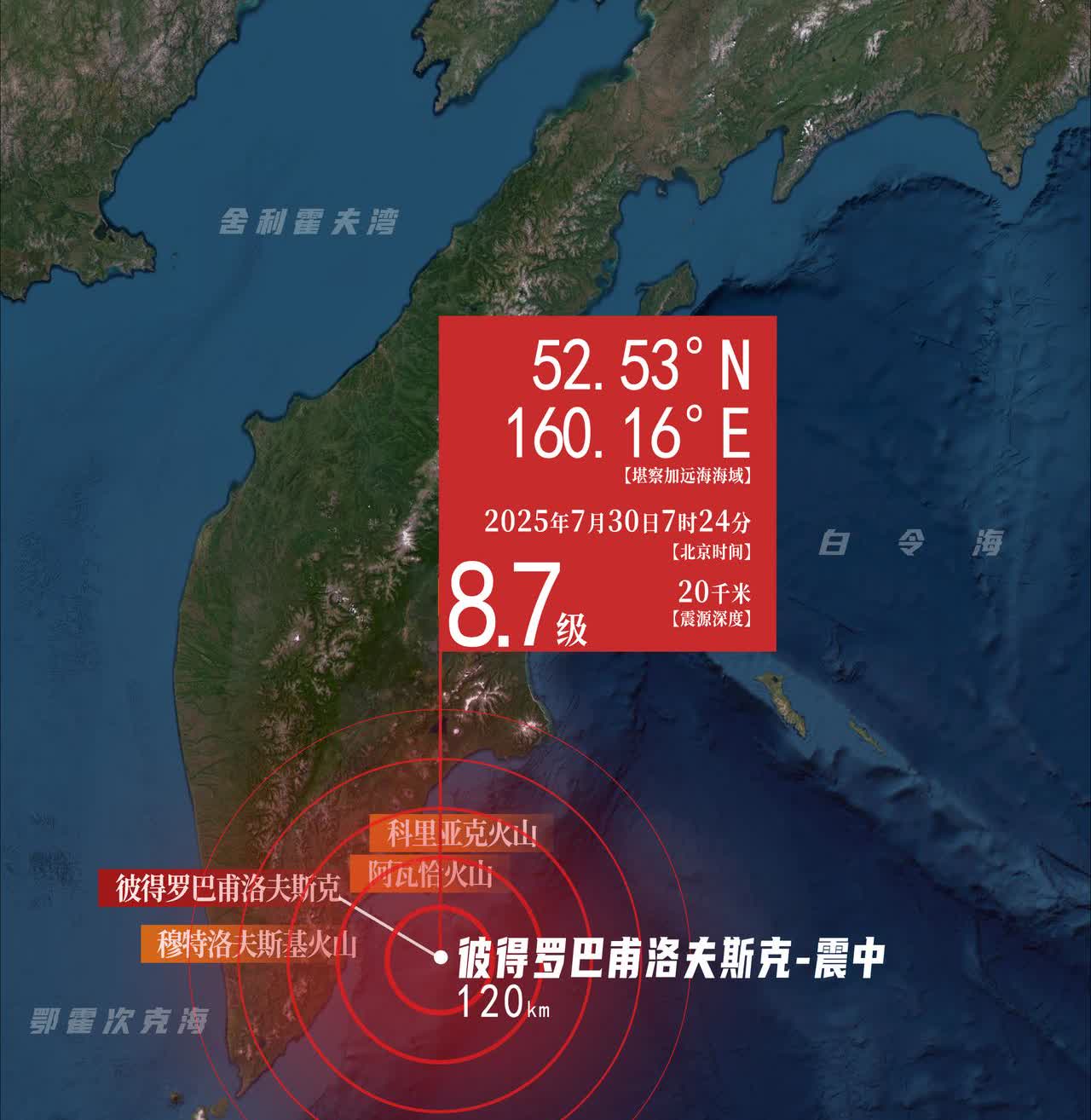今天早上,俄罗斯远东堪察加半岛海域发生8.7级大地震,震中临近该地区首府彼得罗巴