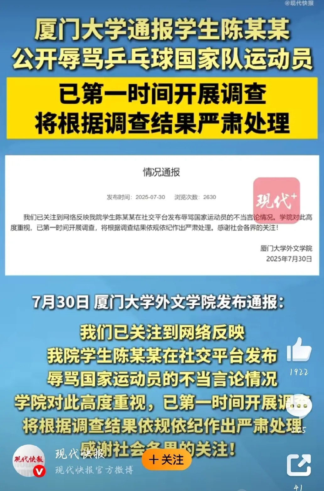 某学校某学生辱骂国家乒乓球运动员, 校方回应学生不当言论: “高度重视,将根