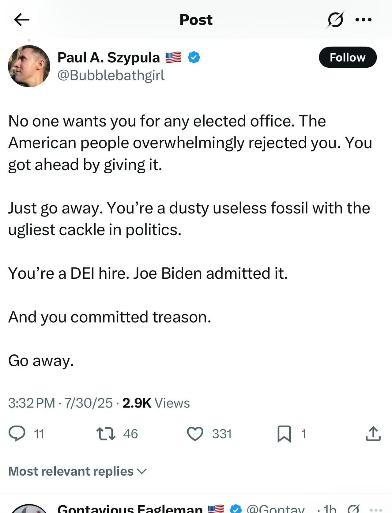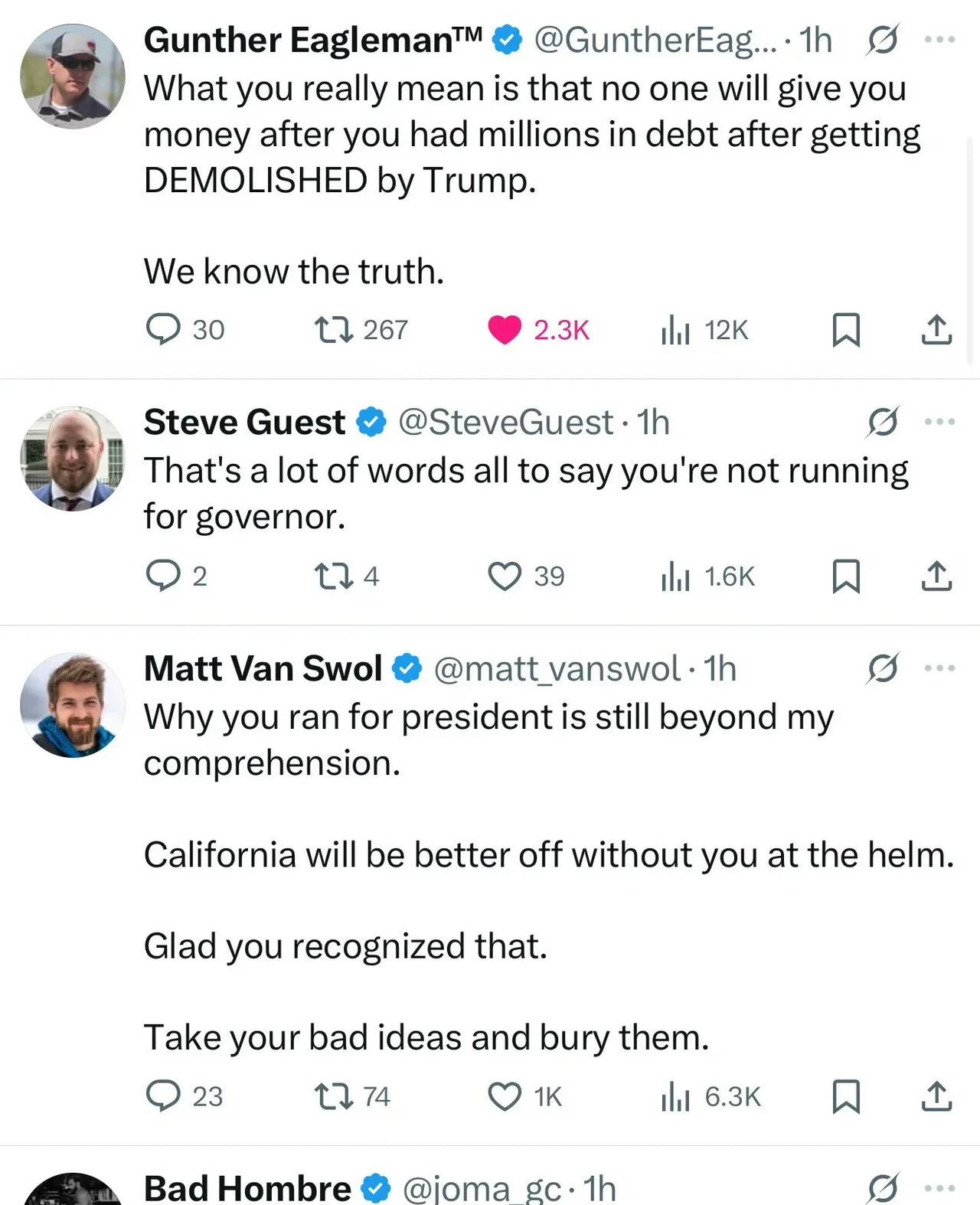 哈里斯今天发的声明,关于竞选加州州长和未来的战斗。 重点是这一句:“但经过深思熟虑,我决定不会参加这次州长选举。” 美国老乡评论: * “你真正的意思是,你被川普打败后欠下了数百万美元的债,没人再给你钱了。这就是真相。” * 说了这么多,只是想说你不会竞选州长。 * 我仍然无法理解你为什么竞选总统。没有你掌舵,加州会更好。很高兴你意识到了这一点。把你的坏主意埋掉吧。 * 我们理解。你上次被打的伤还没好。 * 没人希望你担任任何民选公职。美国人民压倒性地拒绝了你。滚。你就是一个满是灰尘、毫无用处的化石,发出政界最丑陋的笑声。你是DEI才被雇来的。乔·拜登承认了这一点。而且你犯了叛国罪。滚。 副总统卡玛拉·哈里斯声明 2025年7月30日 在过去的六个月里,我一直在反思我们国家历史上的这一刻,以及我继续为美国人民奋斗、推进我珍视的价值观和理想的最佳方式。 我是一位虔诚的公务员,从我职业生涯的早期开始,我就相信,我能改变人们的 生活、为更美好的未来而奋斗的最佳方式是从内部改善体制。作为一名检察官、司法 部长、美国参议员和副总统,能够从事这项工作,为加州人民和我们的国家服务,我深感荣幸。 最近几个月,我认真考虑向加州人民请求担任他们的州长。我热爱这个州,热爱它 的人民,热爱它的承诺。这是我的家。但经过深思熟虑,我决定不会参加这次州长 选举。 我非常钦佩和尊重那些毕生致力于公共服务——服务于他们的社区和我们的国家 ——的人们。与此同时,我们必须认识到,我们的政治、我们的政府和我们的机构常常 辜负美国人民,最终导致了目前的危机时刻。展望未来,我们必须愿意通过新 的方法和新的思维来追求变革——致力于我们相同的价值观和原则,但不受相同 剧本的约束。 目前,我的领导和公共服务不会在民选职位上。我期待着再次走出去, 倾听美国人民的声音,帮助选出全国各地无畏奋斗的民主党人,并在 未来几个月分享更多关于我自己计划的细节。 在美利坚合众国,权力必须掌握在人民手中。而我们,人民,必须运用我们的 力量,为所有人的自由、机会、公平和尊严而战。我将继续这场战斗。