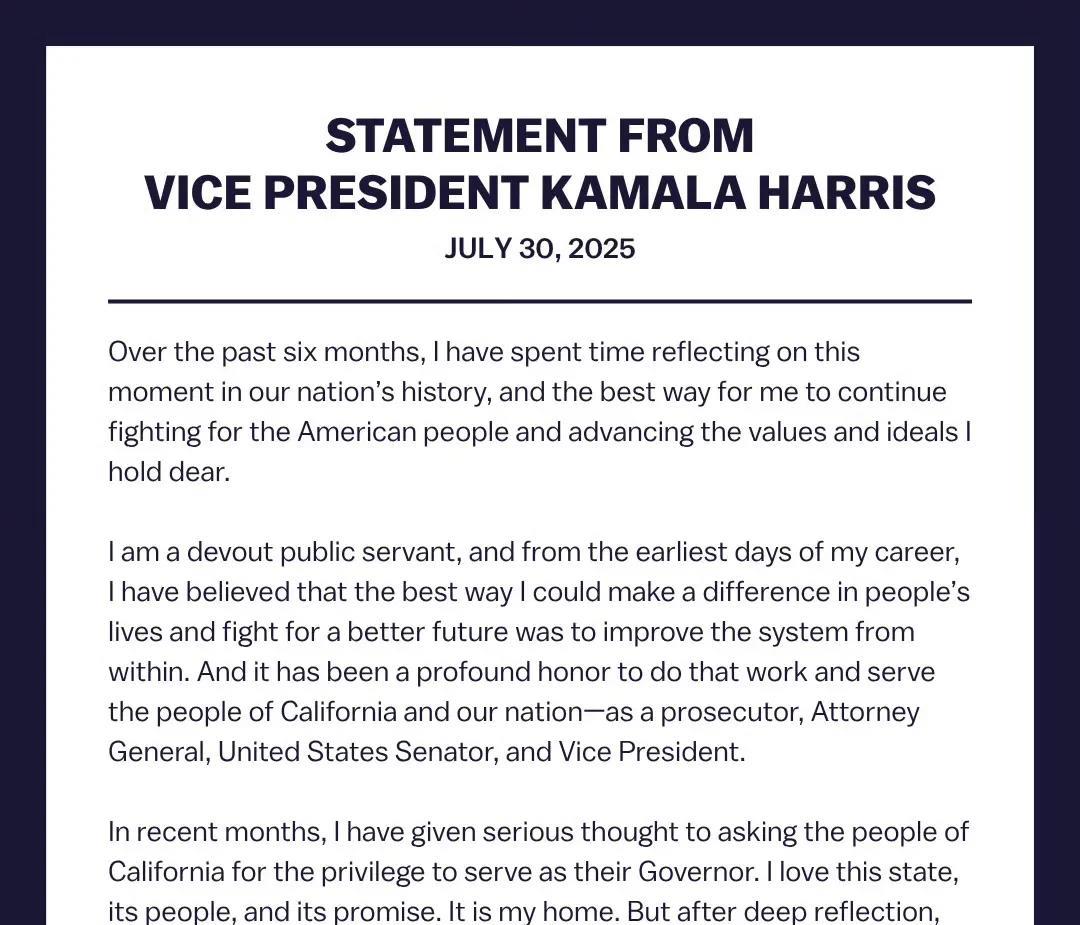 哈里斯今天发的声明,关于竞选加州州长和未来的战斗。 重点是这一句:“但经过深思熟