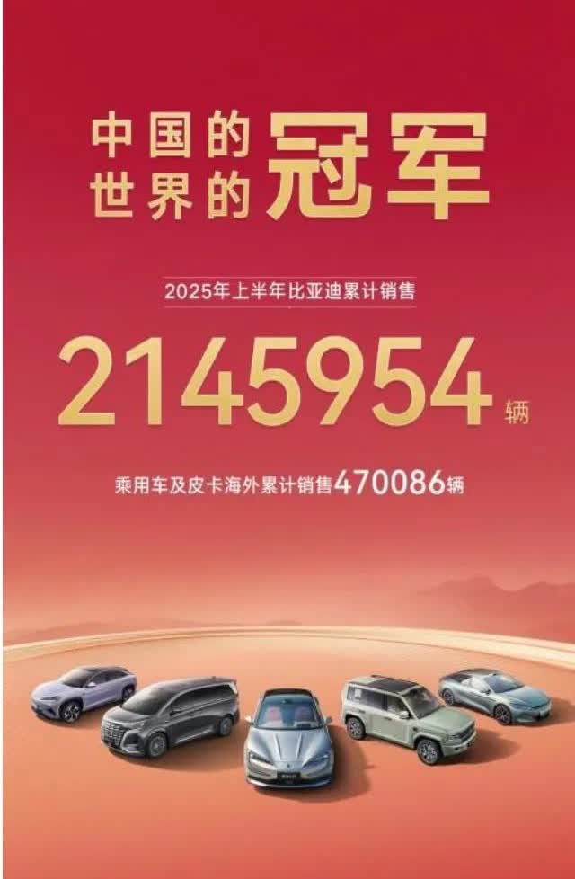7月30日也就是今天早些时候比亚迪集团及公关处总经理李云飞发文宣布,2025年上半年,比亚迪汽车累计销量达到214.6万辆,蝉联中国市场车企及品牌销量第一,同时夺得全球新能源汽车市场销量冠军。 并且2025年世界(财富)500强连续四年上榜,并且首次进入百强行列排名第91名。 比亚迪是新能源汽车行业中国的冠军,世界的冠军! 一步一步走上汽车行业世界第一!