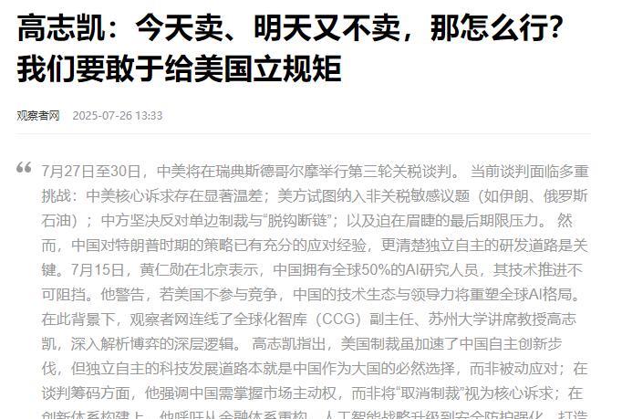 一针见血!高志凯教授又发表了高论,他说,不用把美国取消制裁当筹码,恰恰相反,以后让不让你进入中国市场,决定权在中国。 高志凯教授这话,算是真正说到点子上了。中美贸易博弈走到今天,中国手里的“市场准入”这张牌,早就不是当年任人拿捏的小筹码,而是实实在在能左右战局的王炸。 就拿大疆来说,美国喊着“国家安全”搞了好几年制裁,又是限制采购又是禁售,结果呢?北美消费级无人机市场75%的份额还是大疆的。美国嘴上说要换替代品,实际操作中却绕不开——同类产品要么价格贵出三成,要么续航、画质差一大截。 再看美国那些巨头企业,对中国市场的依赖早就刻进了产业链里。波音公司这几年财报里写得明白,中国市场贡献了其全球订单的30%,中国稍微调整宽体机采购计划,西雅图的生产线就直接停了三条,上千工人临时休假; 英伟达更直接,中国市场占了它数据中心芯片业务45%的收入,美国刚出台芯片出口限制,它就连夜推出“特供版”芯片,性能调整到刚好符合限制标准,就为了能继续往中国卖; 还有美国军工领域,看着挺强硬,但其导弹制导系统、隐形战机涂层里的稀土材料,80%的加工环节依赖中国企业。这些实打实的依赖,决定了中国现在有底气说“切哪里、切多深,我们说了算”。 这种主动权的翻转,不是凭空来的,是中国从被动防御到主动布局一点点磨出来的。以前美国抡起制裁大棒,咱们常得琢磨怎么应对,现在不一样了,手里攥着“技术自主+市场规模”的组合拳,腰杆自然硬。 更关键的是,现在中国开始重塑市场规则了。外资想进来分蛋糕,就得按中国的规矩办。特斯拉上海工厂落地时,咱们明确要求本地化率必须超95%,这几年下来,其供应链里中企占比从30%涨到了70%,不仅带动了本土零部件企业成长,还让特斯拉成了“中国造”的受益者。 苹果也是如此,这几年供应链里中国企业的份额从20%提到了45%,连芯片封装测试都交给了长电科技这些本土企业,想在中国市场挣钱,就得把产业链的甜头分给中国企业。这种规则重塑,就是在告诉全世界:中国市场大门敞开,但得按我们的章法来,没有谁能例外。 说到底,中国的底气来自三个硬支撑。超大规模市场形成的虹吸效应,14亿人的消费需求和持续升级的产业需求,全球企业都想分一杯羹,不来就意味着被竞争对手甩在后面。 全产业链的抗压能力,从袜子、玩具到高铁、核电,几乎所有工业品类都能自己造,别人想断供,我们能快速补位。科技自主的战略定力,别人越卡脖子,咱们越下功夫攻关,5G、新能源、人工智能这些领域的突破,就是这么逼出来的。 这三者凑在一起,就形成了“你卡我技术,我就限你市场”的主动格局,美国的制裁清单看着越来越长,但实际威力越来越弱。