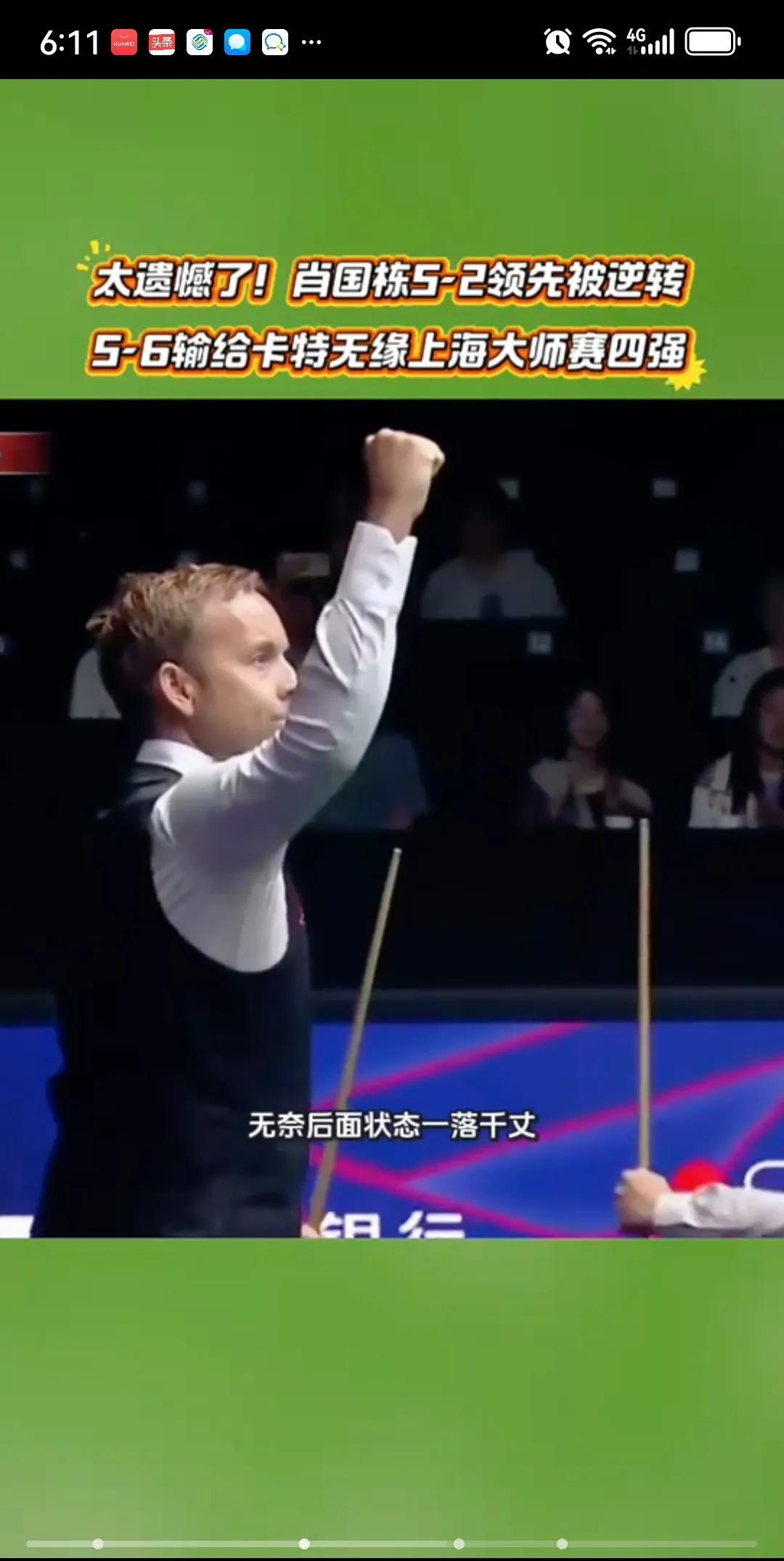 肖国栋5:2领先惨遭卡特逆转。今天下午举行的上海大师赛1/4决赛中。中国名将肖国