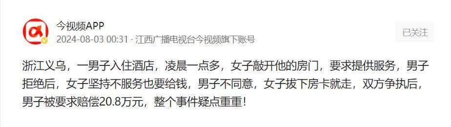 浙江,男子出差入住酒店,半夜睡的正香突然有人连着敲门,男子开门一看,眼前竟是一位穿着暴露的美女,谁曾想,女子一开口就是提供服务。男子一听连忙拒绝,谁曾想,女子离开时竟抢走房卡,两人你追我赶,就在追逐中,女子不慎摔倒,谁料竟要求男子赔偿20.8万元! 在浙江义乌的一家酒店里,小刘出差时碰到了一件怪事。那天晚上他睡得正香,突然被一阵急促的敲门声吵醒。开门一看,有个穿得有点少的女子站在门口,说要给他“提供服务”。小刘一听,赶紧摆手说自己没叫过这服务。但那女子就是不走,还想硬闯进来。两个人就这么僵在门口。 女子拿出手机,翻了翻聊天记录,说是网友帮她约的,房间号也对得上。小刘心里咯噔一下,觉得这里面有诈,死活不让女子进门。女子一看硬的不行,就来软的,说要500块“打车费”。小刘当然不给,女子一生气,抢过小刘的房卡就跑了。 小刘哪肯罢休,追了上去。两人在楼梯间你追我赶,结果女子脚下一滑,摔了一跤,肩膀都给摔骨折了。事后,女子找小刘索赔20.8万。小刘头都大了,赶紧报警。警察调了监控一看,原来是女子自己摔的,小刘没动手。不过因为小刘追了人家,还是得负点责任,最后赔了9000块医药费。 这事儿虽然解决了,但小刘心里那叫一个憋屈。警察一查才发现,原来是信息搞错了,女子才走错了房间。这事儿让大家又开始琢磨,酒店的管理是不是有问题,社会上这些乱七八糟的事儿也得管管了。