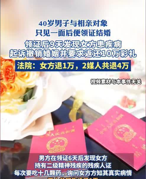 广东河源,一40岁男子在8名媒人的轮流介绍下,终于与38岁的女子闪婚了,并且给了10万彩礼。可女子只拿到了2万,其余8万被几个媒人给分了。在结婚领证后的9天内,男子发现妻子每天能昏睡10个小时,还要吃各种药片,追查之下才得知对方有精神病。男子认为被骗,于是起诉要求撤销婚姻及返还彩礼。可没想到妻子却反驳称:“我是有病,但你也有病啊!咱们半斤八两!” 在广东河源,有个40岁的大龄男子古某,因为一直没娶上媳妇,可把他老妈急坏了。老妈找了8个媒婆帮忙张罗,最后给古某介绍了位38岁的女子司某,两人见面一天就闪电结婚了。 这次闪婚是在媒婆1和媒婆2的安排下进行的,古某给了司某10万块钱彩礼,然后就去领了结婚证。可没想到,结婚第二天,司某就开始整天昏睡,还大把大把地吃药。古某一查,才发现司某有严重的精神病,都拿了8年的二级残疾证了。古某觉得自己被骗了,就去法院起诉,想撤销婚姻,还要回彩礼。 可司某那边却说,她早就知道古某脑子不太灵光,是古某老妈急着抱孙子,想让她停药怀孕,她没同意,就被赶出门了。媒婆也说,她们早就告诉过古某司某有病。一审法院觉得媒婆和司某都提醒过古某了,就没支持他的诉求。古某不甘心,又上诉了。二审法院觉得,虽然说了司某有病,但没说病得多重,还有对生孩子有啥影响,这就算是没说完,所以还是判撤销婚姻。说到彩礼这事儿,法院看了说这对夫妻只过了9天日子,彩礼理应退回来。但男方古某自己也有没留神的地方,所以最后法院判了:女方司某得退1万块,介绍人1退1万,介绍人2退3万。 这婚姻因为藏着掖着和误会,很快就散了。法院最后裁定这婚得算没结,彩礼也得退点回去,这事儿就说明啊,结婚时知道真相和讲诚信有多重要。