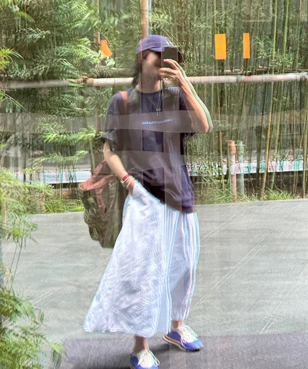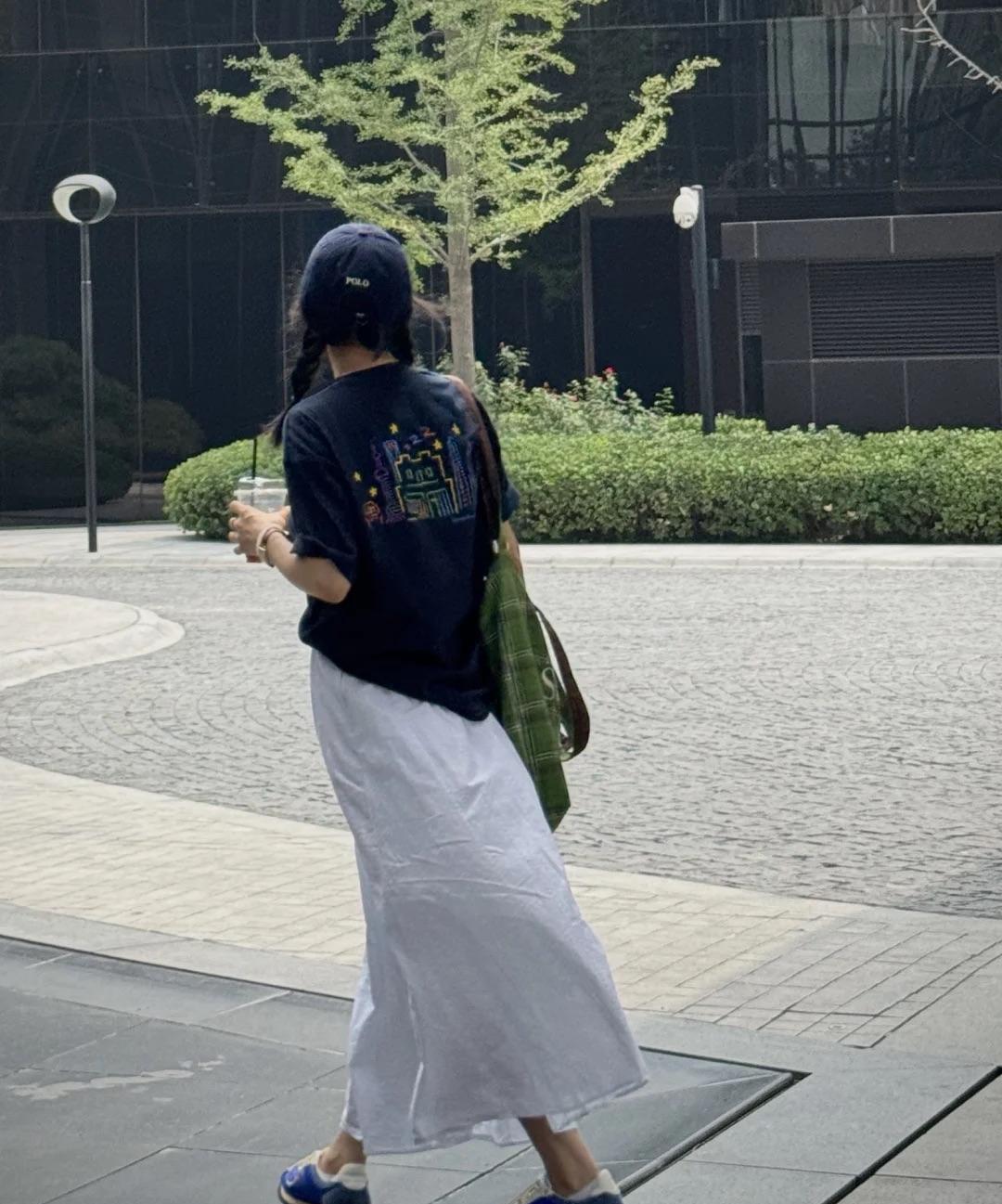 30岁也可以穿的很有少女感... 超爱这个小姐的穿搭,藏蓝色的宽松T恤,搭配 一条白色长裙简洁又大方。 这里挑选了蓝色的棒球帽和蓝色鞋子呼应T恤, 再加上一只绿色的格子帆布包增加文艺感,简约又时髦。