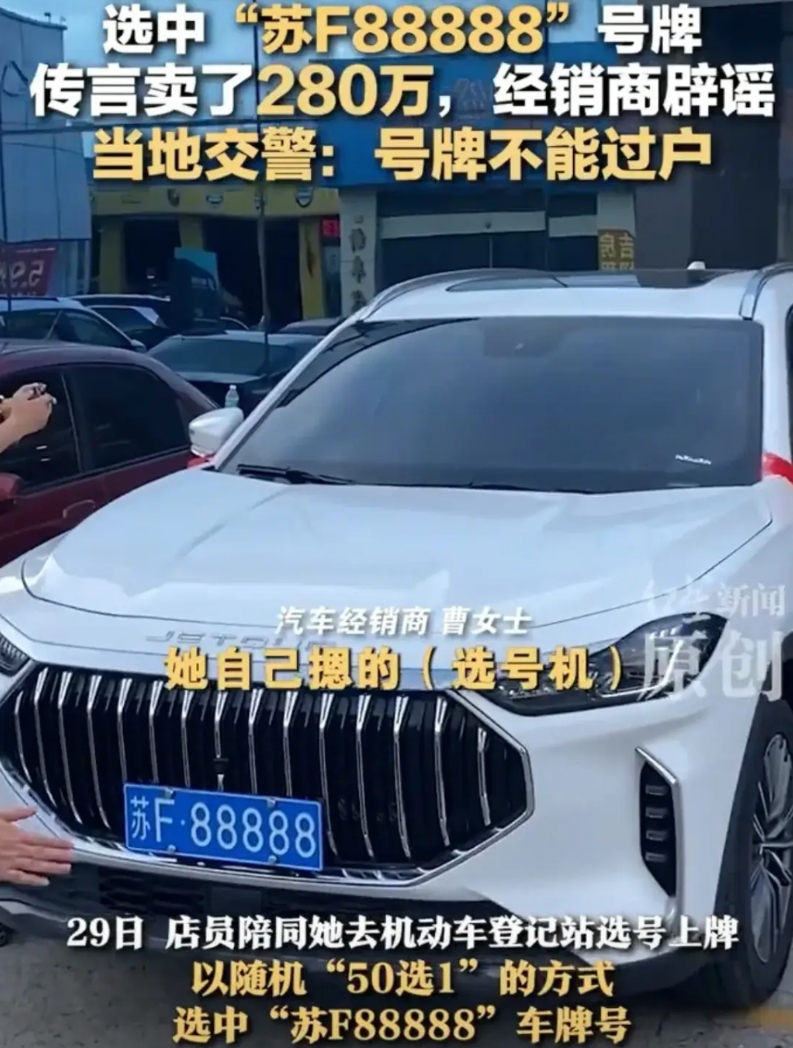 据现场目击者吴先生讲述,这位女士是外地人,在当地工厂上班,当天她在车管所给新车上牌,通过选号机随机摇号时,屏幕上竟然跳出了“苏F·88888”的号码。吴先生说,这种纯数字的“豹子号”普通人能摇到非常少见,当时整个大厅的人都围过去看了。