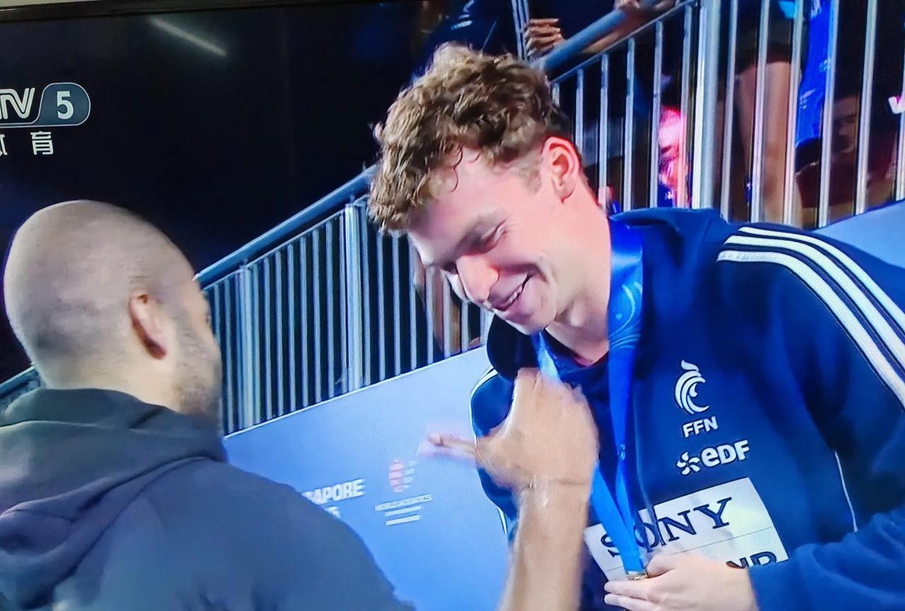 法国NBA巨星、马刺队的三驾马车之一帕克给新加坡游泳世锦赛男子200米混合泳冠军也是该项目世界纪录保持者法国人马尔尚颁奖,马尔尚半决赛创造的1分52秒69也是本届新加坡游泳世锦赛开赛至今诞生的唯一一个新的世界纪录,1分52秒69,也打破了美国名将罗切特保持14年的原纪录1分54秒都纪录,马尔尚决赛夺冠也打开了1分54秒的原世界纪录,成绩为1分53秒68。