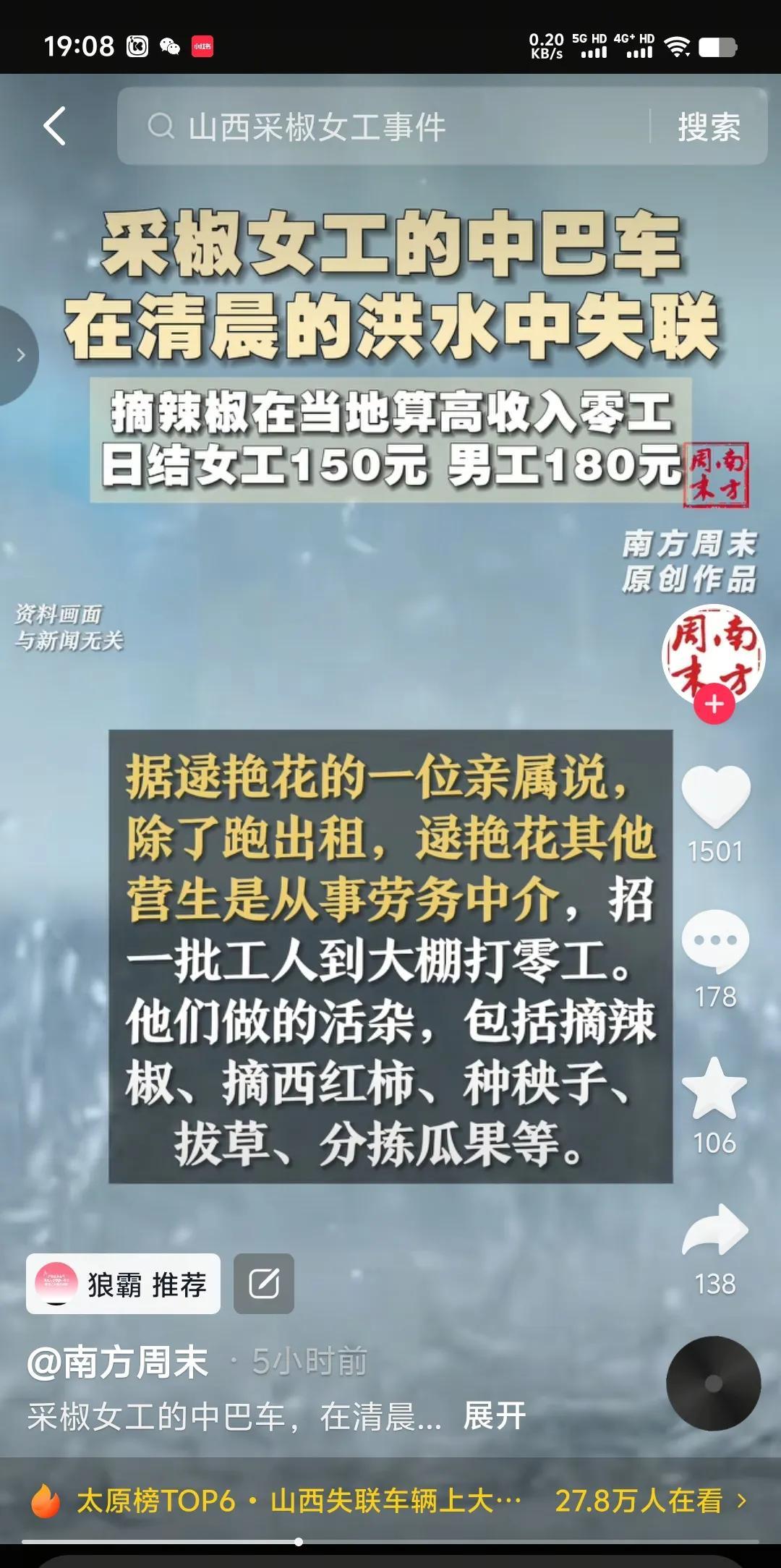 有些是天灾,有些是人祸,有些是天灾加人祸。明明下着大雨,明明发布了红色山洪预警,为什么还要挺而走险,作为一名司机,难道连最基本的安全常识都没有吗? 清晨5点02分,司机逯艳花给丈夫打了最后一个求救电话,应该是车辆在过桥时熄了火,随时都会淹没,5点零8分,整车人消失在洪水里。同样是从事劳务中介的刘梅,她怕雨天看不见路,就给工人们打电话,“姐妹们下大雨,不能出去”,就因为多了一份谨慎,庆幸的避免了一场灾难。 早上5点到9点,下午3点到7点,女工日结150,到手130,男工日结180,到手160,20元钱的往返车费。都是为生活而奔波,都是为了碎银几两,可在生命面前挣再多的钱又有什么用,作为一个成年人,稍微有一点儿安全意识,或许它就是一个本不应该发生的悲剧。