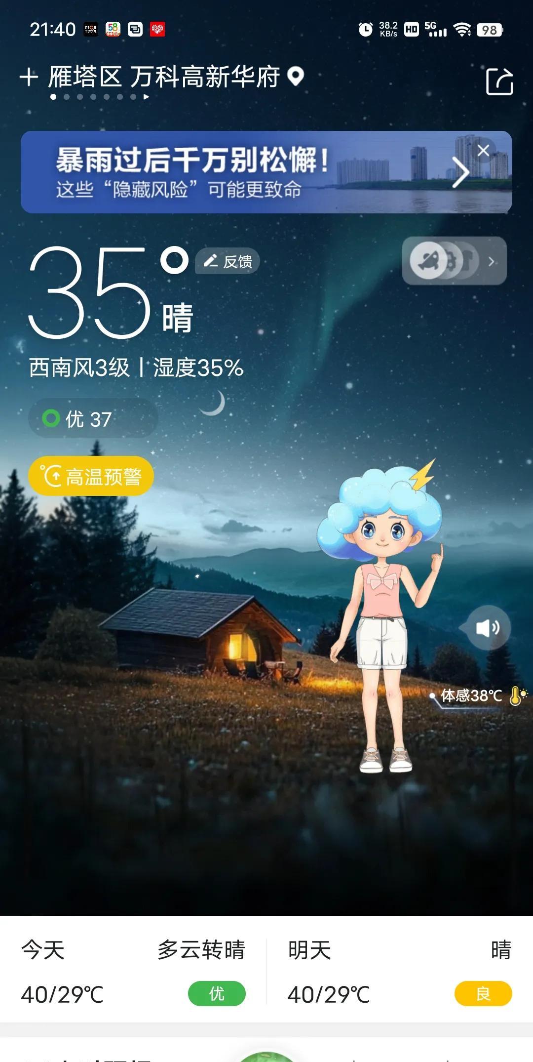 西安40度高温倒计时第8天,今晚截图晚了,快十点了才截图,温度还有35度。 白天