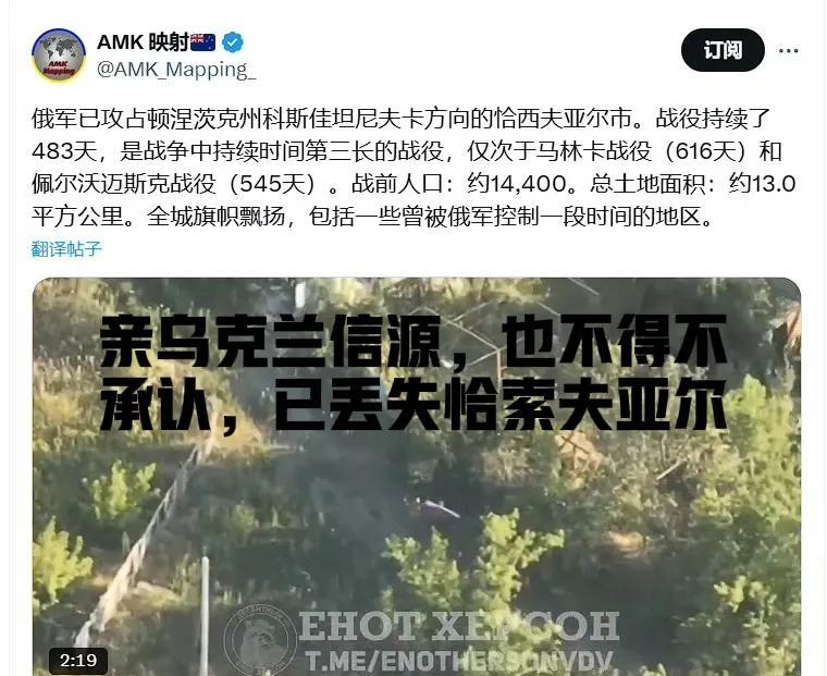 俄军攻占恰索夫亚尔!俄罗斯国防部已宣布,南部军区部队完全占领恰索夫亚尔市。该县城战前人口约1.4万人,总面积13平方公里。恰索夫亚尔战役持续了483天,是俄乌冲突全面开始后第三长的战役。 俄军下一步将继续进攻尼古拉耶夫卡、普利德奇涅,这两个村镇拿下后,俄军就能直扑顿河康斯坦丁诺夫卡的城垣地带了。而在南面,俄军南部军区第8集团军第150摩步师、第20摩步师,两翼合围了克莱班-比科斯克水库,攻占了水库以南所有区域。乌军第100机步旅残部,趁着夜晚逃走。 乌军防御恰索夫亚尔的部队,包括第24机步旅、国民警卫队第18旅、第427无人机团,以及南方的第93机步旅。之前,呼号为“瓦西里”的第93机步旅旅长曾接受西方媒体采访,称"已经8个月没有收到增援了"!部队人员极度短缺,而且现役人员没有轮换。作为乌军顶级精锐部队,这种状况不可想象。乌军显然只能略微补充部分热点地区部队,而且一周前,还把顿河康斯坦丁诺夫卡的附近的,作为总预备队第5突击旅调走,调到了第聂伯罗州的新帕夫利夫卡——那里也正被俄军包抄。