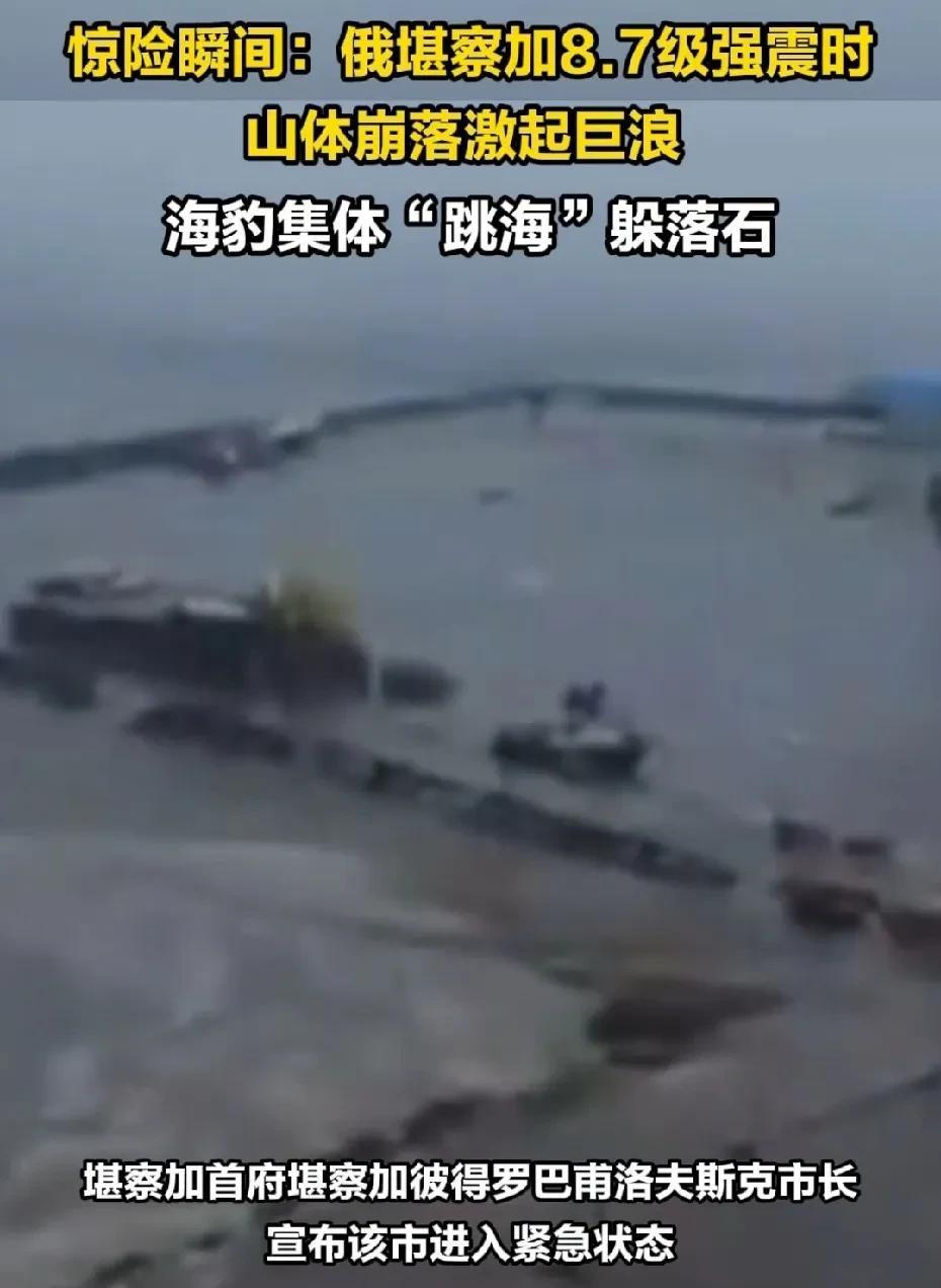海豹集体“跳海”!躲避俄8.7级大地震引起的山体崩裂!画面太过惨烈! 俄勘察东海岸发生地震时,山体地动山摇的画面刚好被一游客拍到,山体上方坠落的石块随着山体斜坡倾泻而下,山体被撞击的烟雾滚滚! 很多在海岸线上方活动的海豹被突如其来的状况惊呆,纷纷跳入大海躲避翻滚的乱石! 地震引起的海啸,达到3米多高,今天还引起了火山喷发!