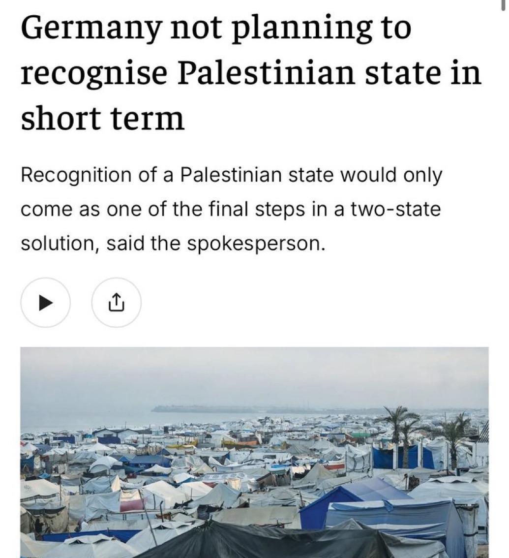 突发:德国计划承认巴勒斯坦国 德国表示,承认巴勒斯坦国的进程必须立即开始。 德国加入了葡萄牙、加拿大、英国和法国行列。 德国计划承认巴勒斯坦建国,招致以色列部长伊塔玛·本·格维尔的批评:“大屠杀80年后,德国又回来支持纳粹主义。” 而此前几天,德国表示短期内不会承认巴勒斯坦国。
