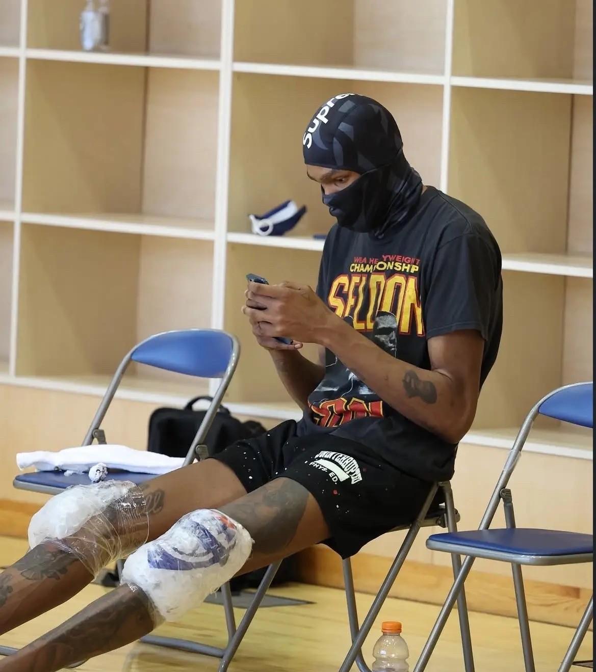 杜兰特蒙面大侠啊 火箭自媒体COACH今日在社交媒体上晒出了杜兰特休赛期蒙面训练照。杜兰特身穿短袖短裤,脸上蒙着黑色面罩持球训练,气质拉满。 训练完之后杜兰特坐在球场边一边冰敷保养,一边玩儿手机。杜兰特两个膝盖都盖着厚厚的冰袋。简单的训练杜兰特都不忘冰敷保养,难怪状态保持的这么好。 上赛季杜兰特出战62场,差3场就能入选最佳阵容。场均36.5分钟拿到26.6分6篮板4.2助攻0.8抢断1.2盖帽,投篮命中率52.7%,三分命中率43%,状态非常出色。 杜兰特现在36岁,比很多年轻的球员状态都要出色。而且杜兰特还是受过重伤,伤停了一年多,能有这个状态,比詹姆斯还要难。杜兰特才是NBA的传奇啊。#头号创作者激励计划#