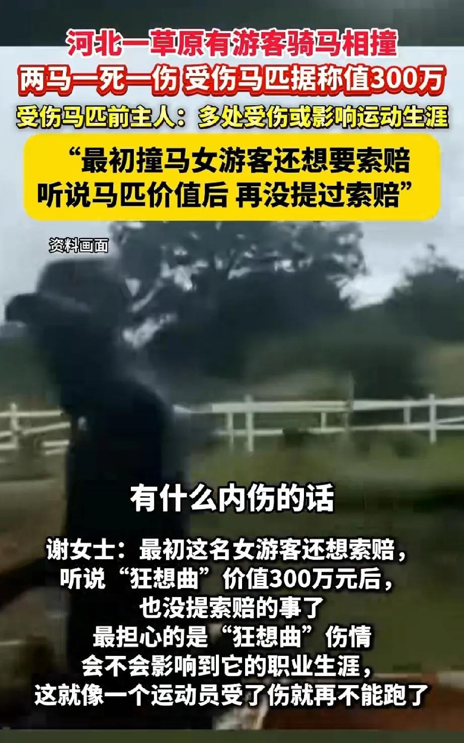 河北一草原上有游客骑马时受伤,并且致使两匹马相撞,结果一马死亡,一马受伤。 近日,在河北的草原骑马时,一名女游客致使两匹马相撞,自己也受了伤。原本她想要索赔,可一听说马的价值,那匹马是曾经参加过比赛的冠军马“狂想曲”,价值300万元,她便不再提赔偿之事了。 有网友称,这么名贵的马,而且是用来参加比赛的,为何要让游客随便骑呢?马的主人也有责任吧。你明知游客骑马只是游玩,技术并不熟练,却还让人家骑,这就好比一个刚拿到驾照的司机,你却把自己的迈巴赫交给他开,这不是咎由自取吗? 所以,此时不能仅凭马的主人说自己的马名贵,反向索赔就把游客吓跑,相关责任应该各自认定才对。另外,这是否是游客操作失误?是否是马儿受惊?是否有关于骑游合同中造成马匹受伤相关赔偿的规定条款等,这些都还是未知数。 朋友们,对于这件事,你们觉得这位游客应该向马的主人申请索赔呢,还是想就此免责呢?