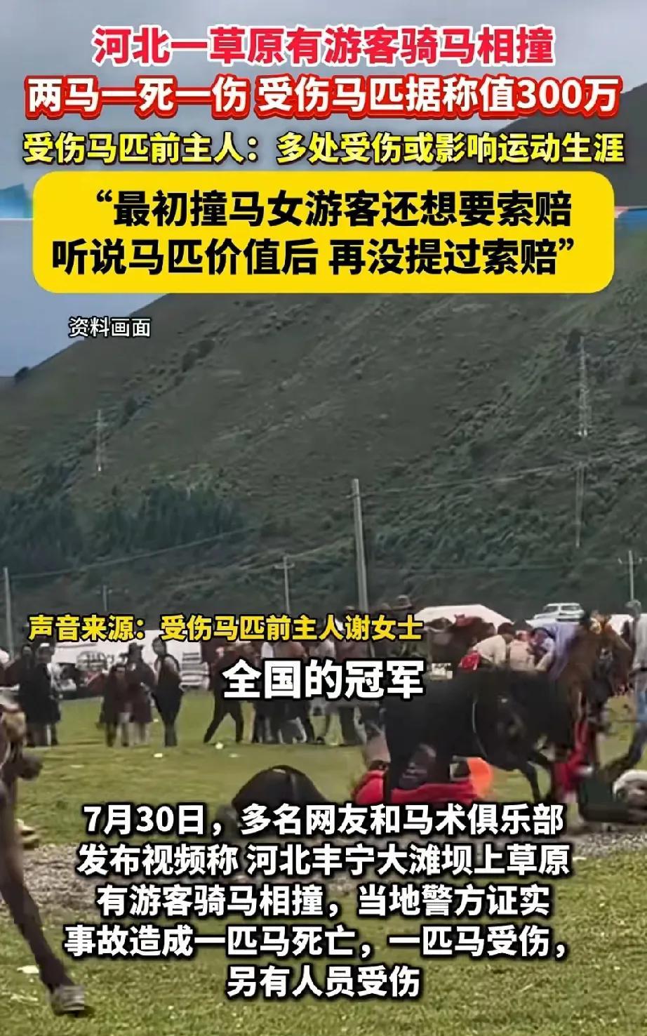 河北一草原上有游客骑马时受伤,并且致使两匹马相撞,结果一马死亡,一马受伤。 近日