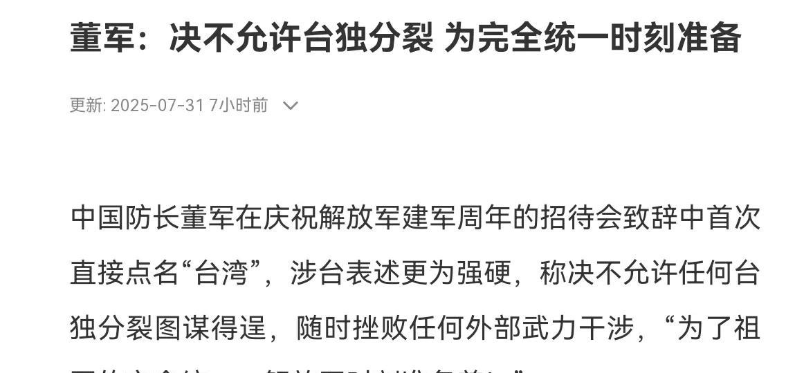 罕见的信号!外媒觉察到了不同寻常的信息!外媒表示,中国的对台表态,更加强硬了!8月1日,根据联合早报报道,外媒表示,中国防长董军在庆祝解放军建军周年的招待会致辞中首次直接点名台湾,涉台表述变得更为强硬了。外媒表示,在去年建军周年招待会的致辞中,我们的防长并未直接点名台湾,而这一次则不大同。 我们的防长这一次明确表示,今年是台湾光复80周年,也是联合国成立80周年,再过一个多月,解放军将以和平之师、正义之师、威武之师的雄姿英貌,接受检阅。我们决不允许任何“台独”分裂图谋得逞,随时挫败任何外部武力干涉,为了祖国的完全统一,中国人民解放军时刻准备着! 很显然,从不点名“台独”到点名“台独”,这种细微的变化,无疑反映着我们国家对于两岸,对于国际格局判断正在发生变化。无疑,我们军方这一次的表态更加的直接,更加的有针对性。这说明什么呢?这最起码说明两点。其一,这说明赖清德及其“台独”势力的所作所为越发的具有挑衅性和危险性,而我们改变平和语调,这意味着武力越来越成为我们解决问题的一个选项。 其二,这无疑也说明,我们对于解决台湾问题越来越自信。我们军方表示,随时挫败任何外部武力干涉,解放军将以威武之师的雄姿英貌,接受检阅。这说明台海局势一切尽在掌握之中,我们解决台湾问题有了足够的自信和底气。这对于“台独”分子意味着什么呢?这意味我们对于“台独”分裂行径越发难以容忍。很显然,两岸局势的破局时刻或许已经不远了。