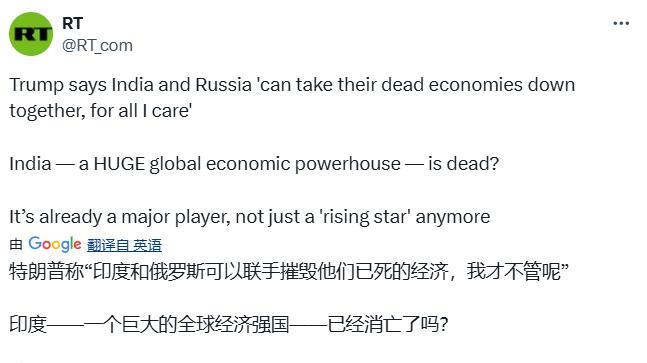 特朗普声称,让印度和俄罗斯“拖着他们垂死的经济,尽管一起沉沦下去吧,我才不在乎呢!”俄罗斯媒体反向讽刺说,印度作为一个“巨大的全球经济强国”,“已经消亡了吗?”评论还指出,印度已经是一个全球经济的“主要参与者”,也不再仅仅是一颗“新星”。令人称奇的是,特朗普这次并没有将中国与印俄相提并论,他是出于什么样的考虑?很显然,特朗普正在对印度发动全面的舆论和心理攻势,从而逼迫印度在关税谈判中让步,并让其停止购买俄罗斯的石油和天然气,而俄方也在支持印度挺住。 #特朗普新“对等关税”税率10%至41%#