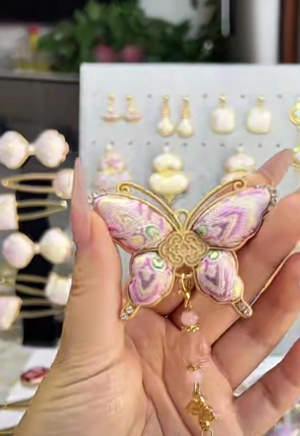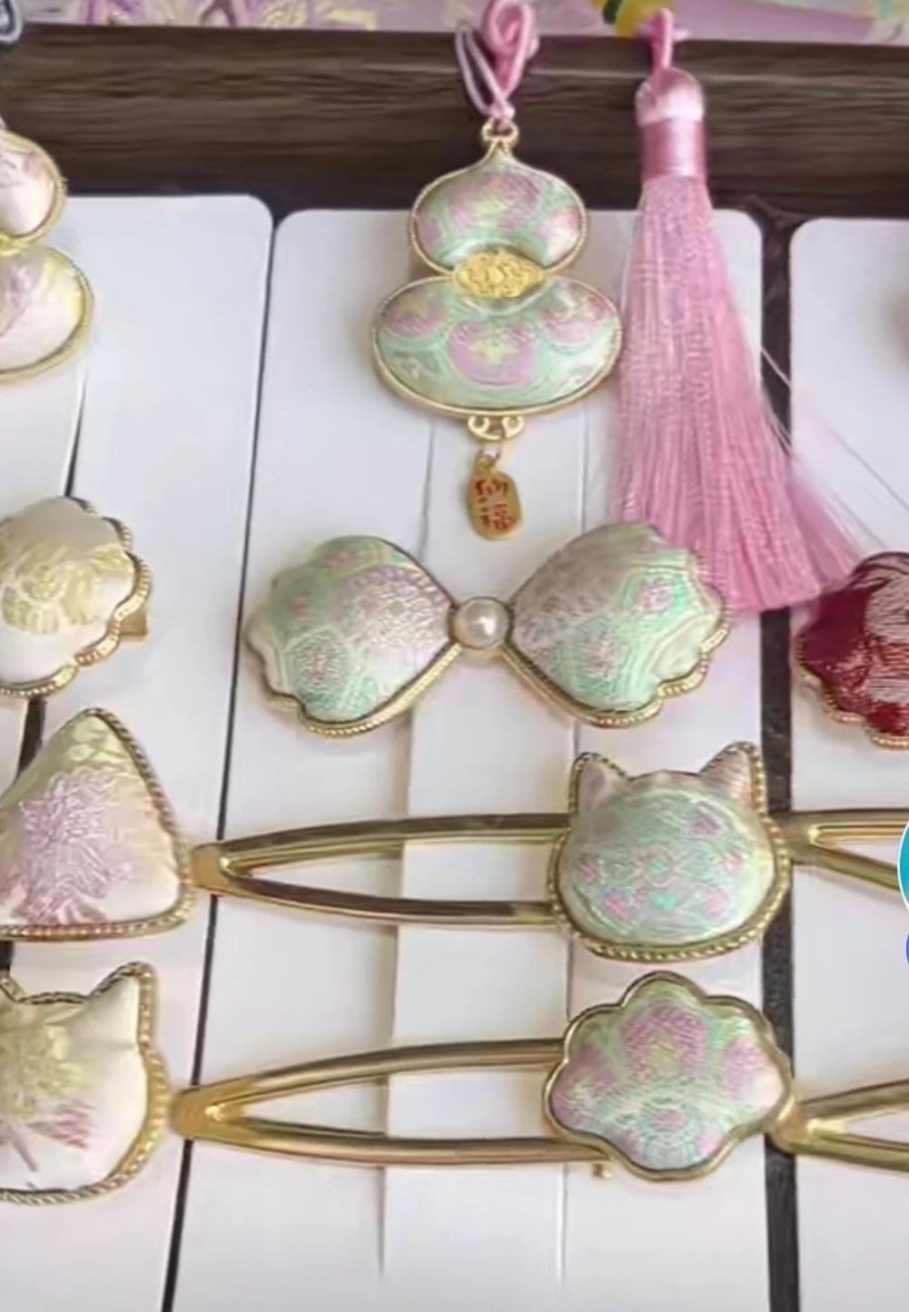 现在流行宋锦做的发卡头饰了!网上店家卖几块钱一个,又漂亮又好看,发卡质地还是宋锦绸缎的比塑料的好多了!一些心灵手巧的友友们还自己买了各种布料配件手工制作DIY,有人还指导自己的小朋友制作,方法简单还能让孩子动动手,自己做的不和别人重复才更有意义,这算是一种非遗文化传承吧! 我挺喜欢这个蝴蝶和葫芦的发卡,做的很精致感觉高大上,布艺发饰自古都有,过去清宫后妃喜欢戴绢花又轻巧又好看,不比那些沉重的金饰珠花差,乾隆的原配富察皇后就喜欢戴各种绒花表示节约,后宫人人都称赞皇后的美德,北京的绢花和扬州的绒花手艺从古流传下来连美国总统都称赞,是我国的非遗文化瑰宝,现在的布艺发卡有异曲同工之妙,那些塑料发卡虽然五颜六色但有点冷硬,没有这些锦缎做的发饰轻巧,这些颜色柔雅花纹精细的布艺发卡华而不显,贵而不炫,戴上发间显得很有品味儿,比起工业风的塑料发卡显得格外别致独特!