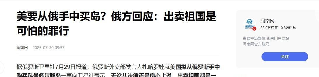 先来说说这科曼多尔群岛,它位于俄罗斯远东地区,在白令海与鄂霍次克海之间,位置那叫一个重要。 群岛上有着丰富的渔业资源,周边海域还可能蕴藏着大量的油气资源。 而且,它处于俄罗斯战略防御的关键地带,是俄罗斯北方舰队进出太平洋的重要通道之一。这么一块风水宝地,俄罗斯自然宝贝得很。 再看美国这边,为啥突然打起了科曼多尔群岛的主意呢? 从战略角度看,美国一直想在太平洋地区扩大自己的军事影响力,对俄罗斯形成更大的战略包围圈。 要是真让美国买下了科曼多尔群岛,那它就可以在这建立军事基地,部署先进武器,直接威胁俄罗斯远东地区的安全,甚至对俄罗斯在太平洋的战略核潜艇部队也能构成不小的威慑。 但美国的如意算盘打得再响,俄罗斯也不可能答应。 俄外交部发言人扎哈罗娃回应得相当干脆,不管从法律还是道德层面,出售国家领土那都是可怕的罪行。 这话说得太对了,国家领土是一个国家的根本,是主权的象征,怎么能拿来买卖呢? 俄罗斯从历史上一路走来,历经无数风雨,为了保卫领土不知道付出了多少代价,怎么可能因为美国这点钱就把自家的土地拱手相让。 从历史上看,美国在领土方面一直野心勃勃。它建国初期,通过各种手段从法国手里低价购买了路易斯安那地区,一下子让国土面积扩大了一倍。 后来又从墨西哥手里夺取了包括加利福尼亚、得克萨斯等西南部的大片土地。 但这些情况和如今想买科曼多尔群岛可不一样,那时的国际形势和现在大不相同,而且当时的交易很多也是伴随着侵略和压迫。 如今在现代国际关系准则下,美国这种公然想买别国领土的行为,简直就是对国际法和国际关系基本准则的公然践踏。 这件事也让我们看到,美国为了自身利益,有时候真的会做出一些让人匪夷所思的举动。它打着各种旗号,在全球范围内到处伸手,试图扩张自己的势力范围。 但它这种做法,只会引起其他国家的反感和抵制。就像这次想买科曼多尔群岛,俄罗斯坚决拒绝,国际上也没几个国家支持美国的这种行为。 话说回来,大家觉得美国接下来还会不会想出别的招,来继续打科曼多尔群岛或者其他俄罗斯领土的主意呢?欢迎在评论区留言讨论。