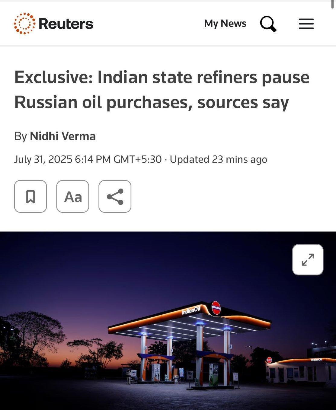 印度怂了!在特朗普的威胁后,印度停止购买俄罗斯石油。印度三哥们也破防了,哭喊印度是独立国家,不接受美国威胁。 印度人实在是外强中干,美国人稍微给点压力就挺不住了。印度4家国有炼油厂已于过去一周停止购买俄罗斯石油。据称这4家炼油厂定期以交货方式购买俄罗斯石油,现已转向现货市场寻找替代供应,主要是中东、西非等级的原油供应。 印度突然停止购买俄罗斯石油,主要是因为美国总统特朗普的威胁。特朗普此前声称自8月1日起对从印度进口商品征收25%关税,他还警告印度购买俄罗斯石油可能会受到惩罚。 一向抖机灵的印度人,为了增加在关税谈判上的筹码,避免被美国所惩罚,暂停了购买俄罗斯石油。印度人嘴上说外交独立性不可怀疑,行动上却比谁都诚实。以为这样就能逃避惩罚,可惜的是美国火眼金睛,特朗普不是昏庸的老拜登。 印度三哥们彻底破大防了,大骂莫迪的无能,和哭喊印度是独立国家,号召抵制美国。 #美国能帮欧洲解决俄乌问题吗##印度暂停购买俄罗斯石油#