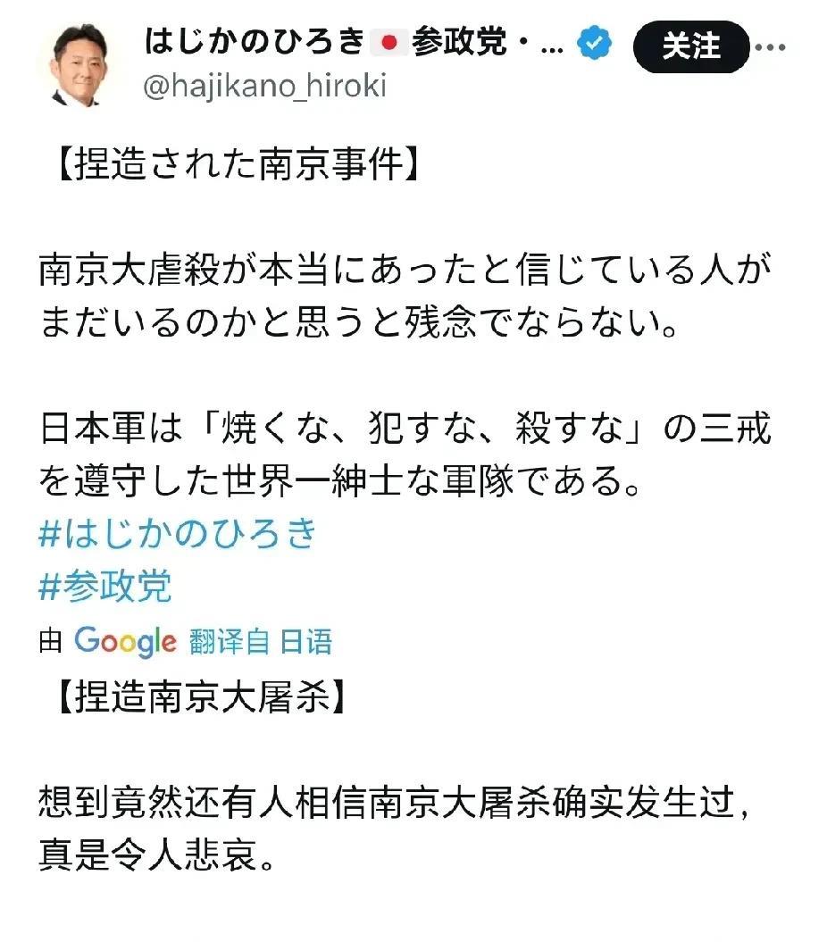 日本参议院议员平木浩发帖声称:日本军队是世界上最有绅士风度的军队,恪守“不烧、不奸、不杀”三戒。想到竟然还有人相信南京大屠杀确实发生过,真是令人悲哀。 这番疯狂的言论简直让人目瞪口呆,他不仅否认南京大屠杀,甚至还企图把日军描述成“文明之师”。 历史不是任人涂抹的画布,而是铁证如山的血泪记录。1937年的南京,30万无辜生命在刺刀与枪口下消逝,幸存者的哭诉至今回荡在纪念馆的每一寸空间。那些被日军士兵亲手写下的日记、外国记者的现场报道、国际法庭的审判记录,哪一样能被“绅士风度”四个字轻轻抹去? 更讽刺的是,他们口中的“绅士军队”连自己人都看不下去。日本老兵的忏悔录里写满了强奸、虐杀、活体实验的细节,《每日新闻》在战败后刊登的《南京恶虐行为》标题刺目如血,这些可都是日本自己的白纸黑字。现在倒好,连自家媒体当年的报道都要被扣上“栽赃”的帽子? 某些政客总爱把“反思历史”曲解成“反日教育”,却忘了正是这种死不认账的态度,才让亚洲邻国一次次寒心。当德国总理在华沙犹太人纪念碑前下跪时,日本高官在靖国神社鞠躬;当欧洲教科书详细记载纳粹暴行时,日本右翼忙着把“侵略”改成“进入”——到底是谁在制造对立? 我们愤怒的不是某个议员的胡言乱语,而是这套话术背后的险恶用心。他们试图用“绅士军队”的童话麻痹年轻一代,用“历史争议”的迷雾模糊是非界限。可惜啊,燕子矶江边的累累白骨不会答应,约翰·拉贝日记里的字字控诉不会答应,东京审判法庭上堆积如山的证据更不会答应。 今天有人敢说“南京大屠杀是虚构”,明天就有人敢说广岛原子弹是活该。历史修正主义的毒瘤从来不会独自生长,它总会蔓延成否定一切战争罪行的疯狂。当平木浩们对着镜头微笑时,那些被刺刀挑起的婴儿、被汽油烧焦的妇女、被集体活埋的战俘,正在另一个世界里凝视着这场人性之耻。 各位读者你们怎么看?欢迎在评论区讨论。