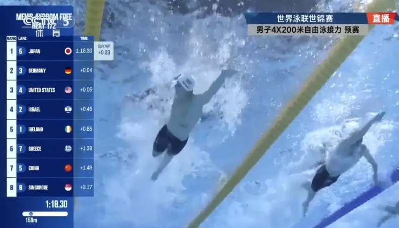 男子4×200米游泳接力, 第一棒:费立纬 1分46秒94,第5名交棒 第二棒:季新杰 1分46秒09,第3名交棒 第三棒:汪顺 1分46秒64,第2名交棒 第四棒:张展硕 1分46秒48,第2名完赛 中国队总成绩7分06秒15,以第六名的成绩进入晚上的决赛。 不出意外,晚上的决赛潘展乐应该会游最后一棒,不知道还会不会有奇迹发生,帮助中国队站上领奖台。
