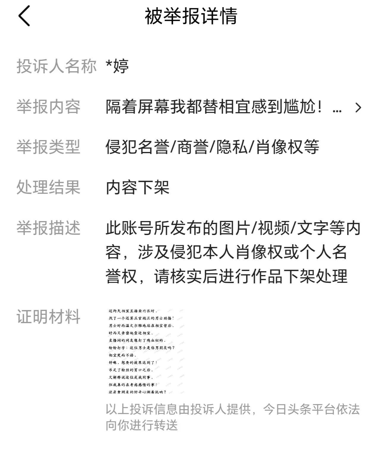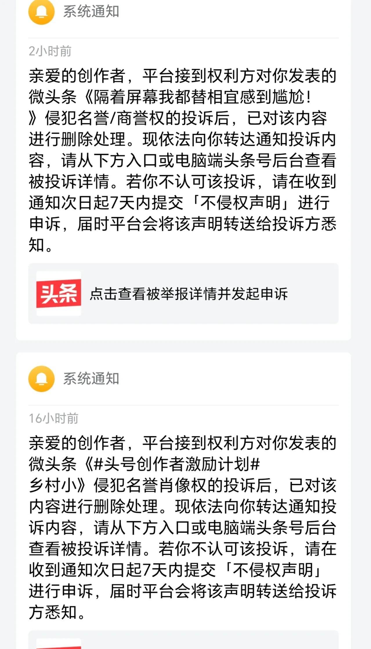 活不起了,今天连着被两个大网红举报! 说实话我现在一看到系统通知, 心就提到了嗓子眼! 果不其然, 连接收到两个被举报, 作品下架的通知! 一个是乡村小乔举报的, 我写她两次,她举报我两次! 每次都说我侵犯她肖像权, 如果要用她照片就私说一下, 我私说一百次,你也不理我呀! 而且两次写她都是向着她说话, 宣传正能量的, 我实在不明白为啥要举报我? 另一个是相宜! 说我侵犯她肖像权个人名誉权。 我就不明白了, 我写的哪一句不是实话? 我又没有故意抹黑你, 你自己天天在网上发, 你的事谁人不知? 怎么就侵犯你名誉权了? 真的心累! 我这个帐号不知不觉写垂直了, 定位方向就是八卦网红那些事, 可大网红们天天举报咱, 这是不给普通人留一点活路呀! 我都怀疑我是不是招黑体质? 那么多人写她们,捧她们的, 骂她们的都有。 为啥偏偏举报我? 我这样的小虾米生存何其艰难? 为啥要盯着我呢?求放过!