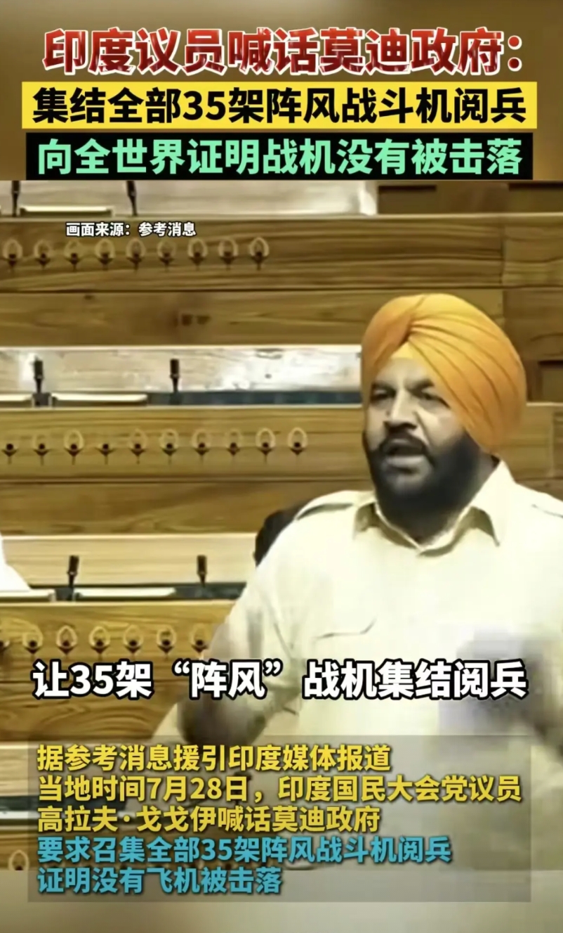 人才啊!印度一议员要求集结全部阵风战机,进行一次展示,以便向全世界证明阵风没有被击落!莫迪听了不断喝水,我感觉他恨不得上去给这个猪队友议员两耳光。 被打掉了5架阵风,哪里找的出35架出来,比如这个001号阵风早就变成零件了。不过话说回来,要不连夜找下马克龙,从法国空军先调配5架过来。