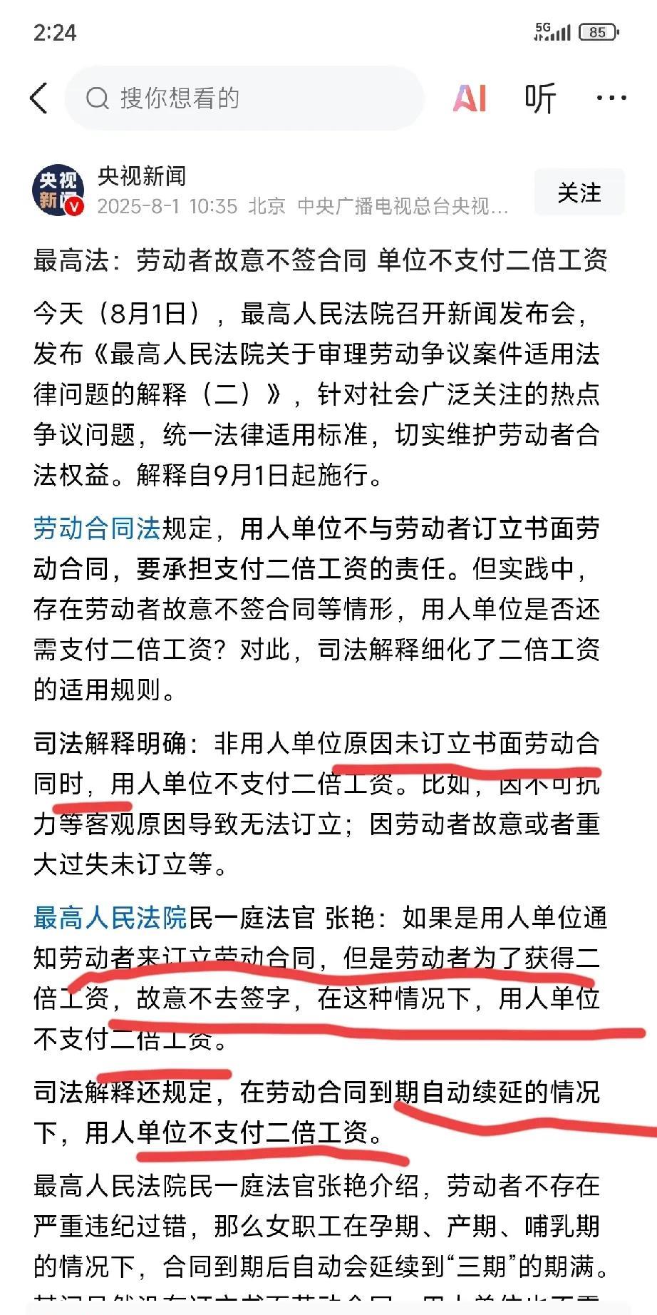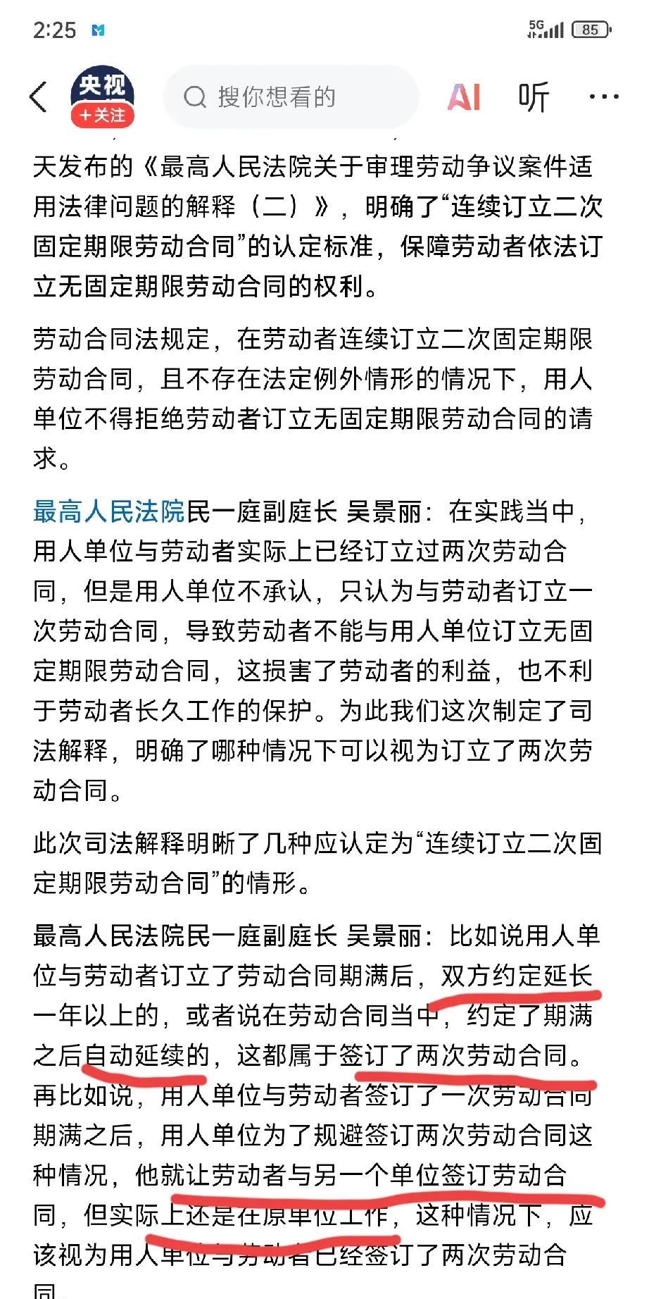最高法关于审理劳动争议案件适应法律问题的解释(二)出台了,对很多地方进行了细化。 第一,任何“不缴社保”的约定无效,这条是保护劳动者权益的超级条款。这是针对很多公司就低端工作岗位事先约定不缴社保的情况,最高法明确,劳动者随时可以要求经济补偿。 第二,为保护公司老板被恶意利用未签书面劳动合同追索两倍工资情况,规定劳动者故意不签订或重大过失未签订合同,公司不用支付两倍工资。 第三,针对有的公司规避连续两次签约固定期限合同,之后员工有签无固定期限合同的权利,采取的诸如换公司签约、不签约继续干等各种骚操作,司法解释明确了“关键是看员工是不是在原岗位干”的认定标准。 各种细节条款还有很多,以后用人单位缴社保应该会是普遍情况,但社保基数每年上调的情况下,普通行业员工每月到手工资估计会很难上的去。 条款总体上更加注重对劳动者权益的保护,也对一些专门钻条款空子索赔公司的情况进行了打补丁。 希望涉及这些劳动争议的,司法解释还是更加细化比较好。