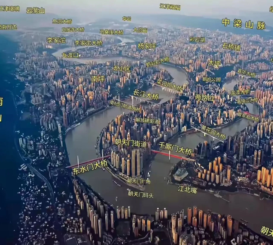 重庆主城区两江四岸几十座跨江大桥及轨道桥!这只是其中一小部分城区面积。