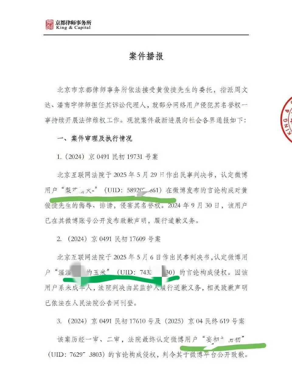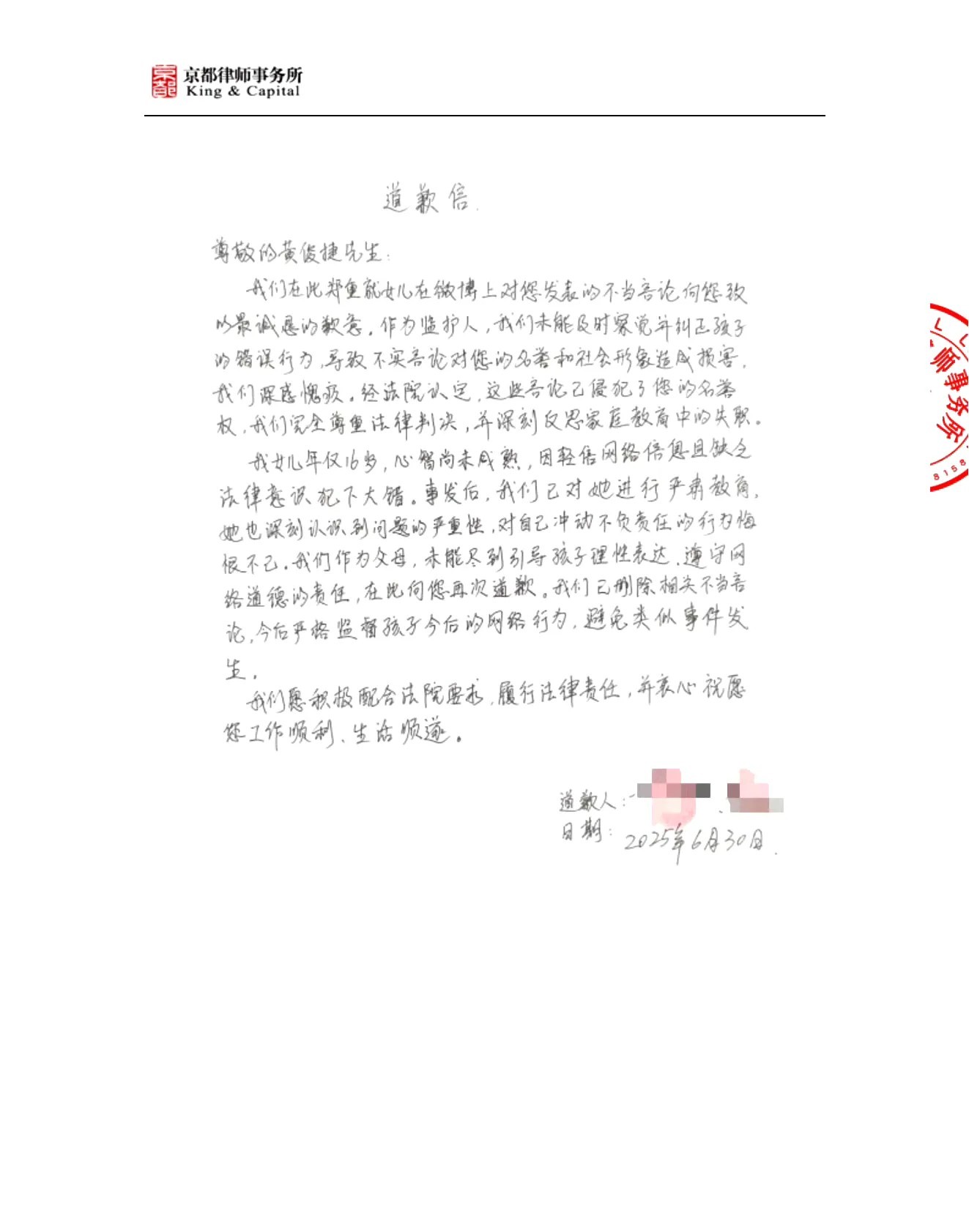7月份已经看到三个明星告这家了,她们先后跟肖战道歉、任嘉伦道歉,现在又要跟黄俊捷道歉。 而且这次跟黄俊捷道歉的还有一位刚满16岁的女孩子由父母代为道歉的!被职业粉丝带着追星的结果,很多涉世未深的女孩子在这些人的忽悠下,在网络上肆无忌惮。说实话我看到这里觉得挺痛心的! 不知道这位二字男明星的手机有电没?充了话费没有?你不发朋友圈可以,至少看看这些因为你被告的小粉丝吧!