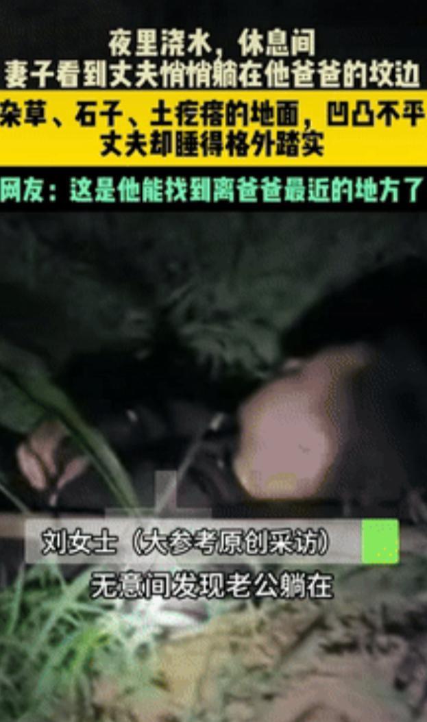 “看哭了!”河北一夫妻夜间去地里浇水时,妻子突然找不到丈夫了,她四处寻找,最终在公公坟前找到了他,丈夫躺在凹凸不平,土疙瘩的地面,可他却睡得格外踏实,妻子看到这一幕,没有上前打扰,网友:这是他能找到离爸爸最近的地方了! 河北乡下的秋夜凉得透骨,玉米地刚浇了半亩,水渠里的水哗哗地流,把土泡得软乎乎的,李娟(化名)直起腰,捶了捶发酸的后背,想叫丈夫歇会儿,转头却没见着人。 夜里十一点多天墨黑一片,只有手电筒的光束在地里晃,丈夫王强(化名)刚才还在渠边摆弄水泵,怎么转个身的工夫就没影了? 李娟心里有点慌攥着电筒往四周照,光束扫过密密麻麻的玉米秆,又掠过远处的坟地,那片地是村里的老坟茔,公公就葬在那儿。 她顺着田埂往前走,鞋跟沾了泥,沉甸甸的,快到坟地边时光束突然定住了,王强就躺在公公的坟前,蜷着身子脑袋枕在一块土疙瘩上,嘴角微微张着睡得正沉。 坟头新培的土还带着潮气,混着几根没除净的杂草,他就那么不管不顾地躺着,仿佛身下不是硌人的泥地,是家里铺着棉絮的炕。 李娟站在原地手电筒的光在他脸上晃了晃,他睫毛颤了颤没醒,她这才松了口气,心里头却像被什么东西堵着,酸溜溜的,结婚这五年她知道王强的脾气,再累也不会在地里随便躺,除非是到了这儿。 她悄悄走过去蹲下身,把电筒的光调暗了点,他后背上的汗湿了一大片,沾着草屑裤脚卷到膝盖,小腿上全是蚊子咬的红疙瘩,李娟伸手想把他额前的头发拨开,手到半空又停住了,轻轻收了回来。 这不是他头一回在这儿睡着,王强是独苗,他妈走得早,他爸一个人又当爹又当妈,在砖窑上搬了十年砖,供他读完初中。 有回王强劝他爸再找个伴,老头瞪着眼骂他:“找啥找?挣的钱够给你攒彩礼就不错了!” 话是凶的,眼角却湿了,三年前老头查出病,没撑过半年临走前攥着王强的手,话都说不囫囵了,还在念叨 “地里的麦子该追肥了”。 从那以后王强像变了个人。以前爱跟朋友出去喝酒,现在下了工就往地里钻,家里的活儿抢着干话却少了一半。 李娟知道他心里苦,只是他从不肯说,有次起夜她发现王强不在炕上,披上衣服出去找,就见他在公公坟前坐着,对着墓碑抽烟,烟蒂扔了一地,嘴里嘀嘀咕咕的,像是在跟谁说话。 今晚他们从傍晚就开始浇水,水泵坏了两回修到后半夜,王强的眼睛都红了,李娟催他歇会儿,他说 “浇完这垄就歇”,谁知转身就跑到了这儿。 她看着他熟睡的脸,突然明白过来,他哪是累得随便找地方躺,是潜意识里就往这儿奔,这是他能靠着的地方,是他觉得最踏实的地方。 风从玉米地里钻出来,带着土腥味吹得坟头的纸幡轻轻晃,李娟往他身边挪了挪,脱下自己的外套,轻轻盖在他身上,外套上还带着她的体温,王强似乎感觉到了,往外套里缩了缩,眉头舒展了些。 她就那么守着听着水渠里的水声,听着远处偶尔传来的狗吠,天快亮时王强终于醒了,看见身上的外套,又看见蹲在旁边的李娟,脸一下子红了,搓着手想解释:“我…… 我就想歇会儿,不知咋就睡着了。” 李娟没说话,拉着他站起来,拍了拍他身上的土,他的裤腿沾了泥,膝盖处磨出个小洞那是刚才在坟头蹭的。 后来把这事儿发到了网上,底下评论刷了屏,有人说 “看哭了”,有人说 “这是他能找到离爸爸最近的地方了”。 王强看到评论时,正蹲在灶台前帮李娟烧火,火苗舔着锅底映得他脸红红的,他没说话只是往灶膛里添了把柴,火星子 “噼啪” 跳起来,像极了小时候他爸给他讲故事时,灶台上跳动的火光。 (信息来源:大参考 2025年7月31日)